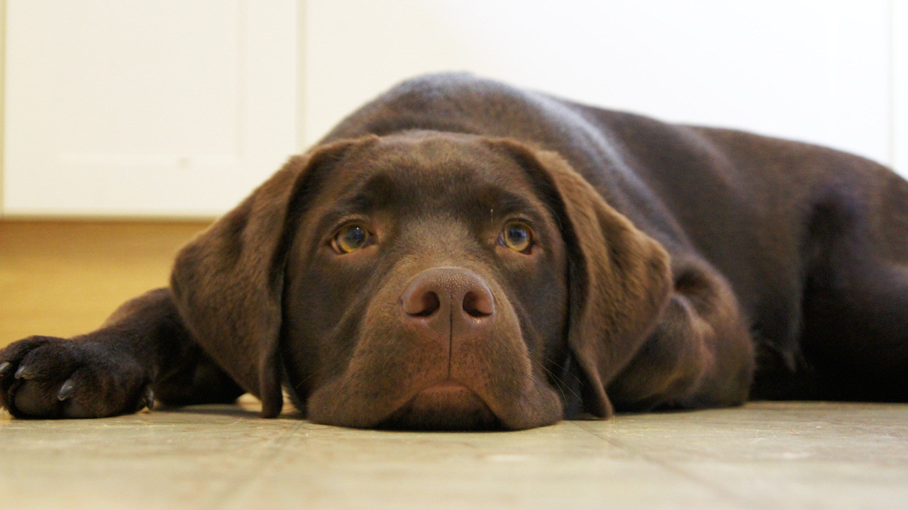 Description: A dog laying on the floor looking at the camera with a sad look on his face and eyes.