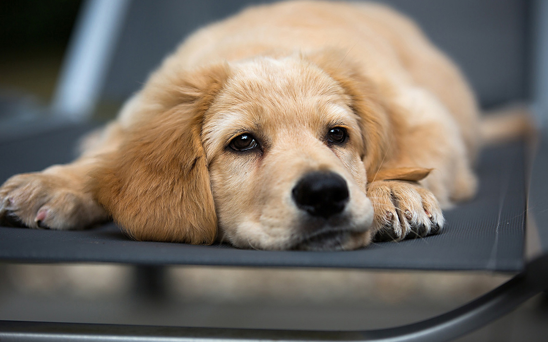 Description: A dog laying on a chair looking at the camera with a sad look on its face and eyes.