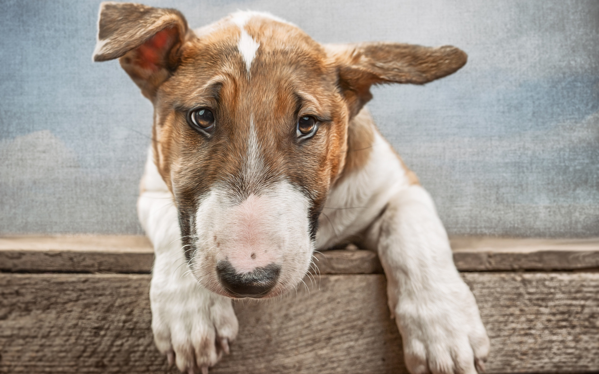 Description: A dog is sitting on a ledge looking at the camera with a sad look on his face and nose.