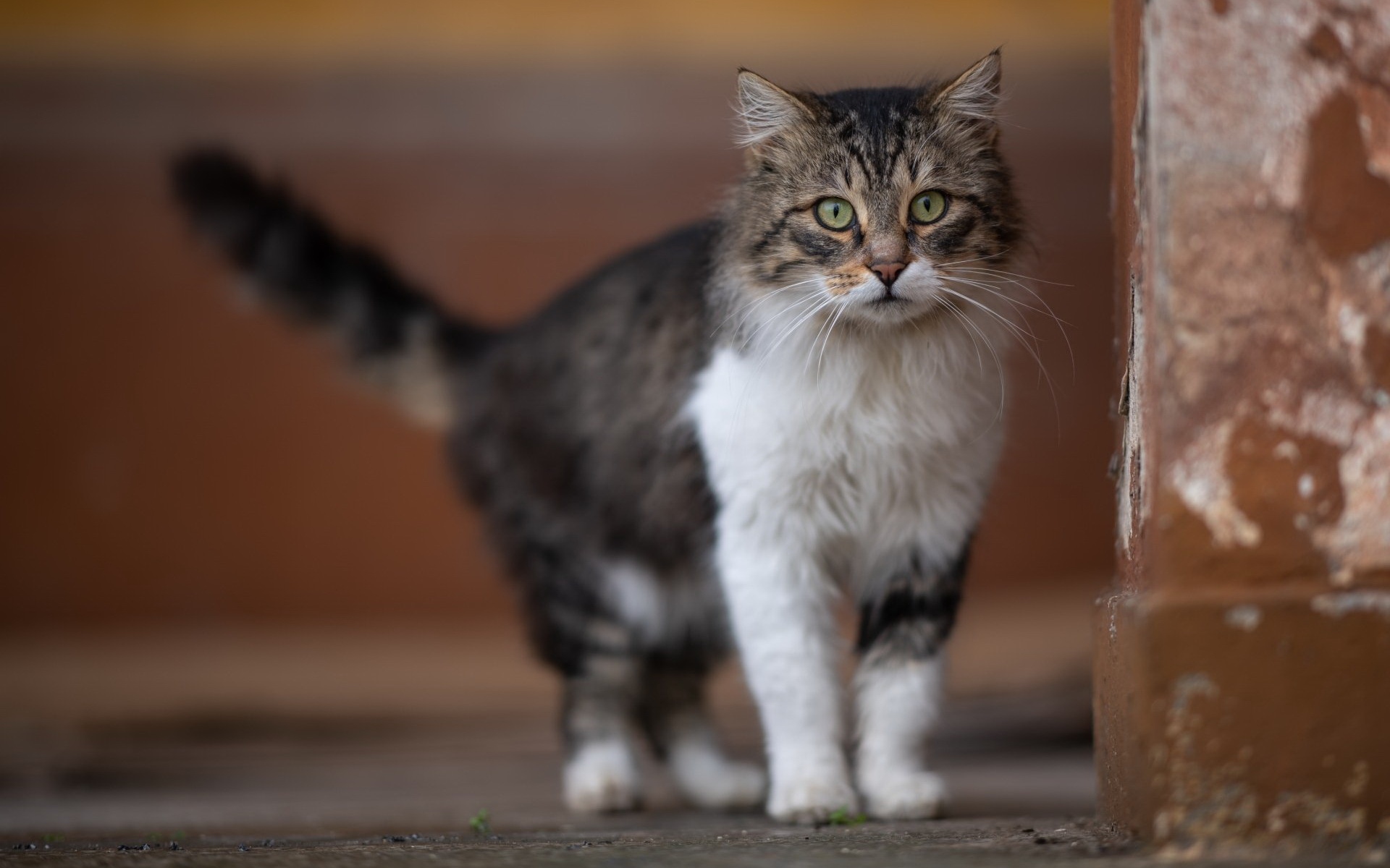 Description: A cat standing next to a wall looking at the camera with a sad look on its face and eyes.
