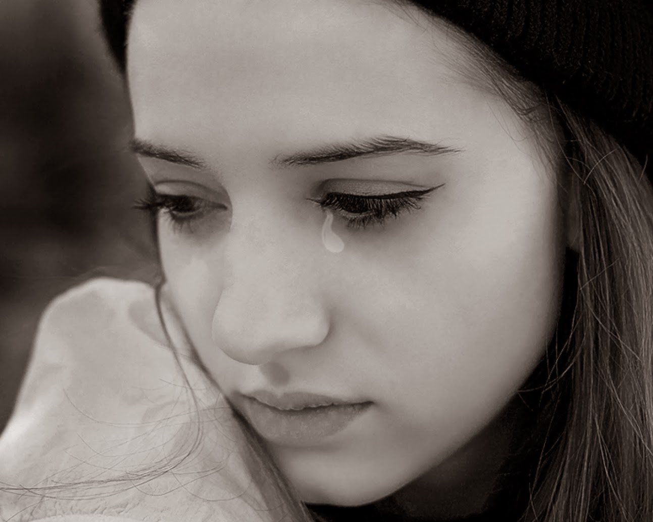 Description: A woman with a sad face holding a cell phone to her ear and crying with tears on her face.