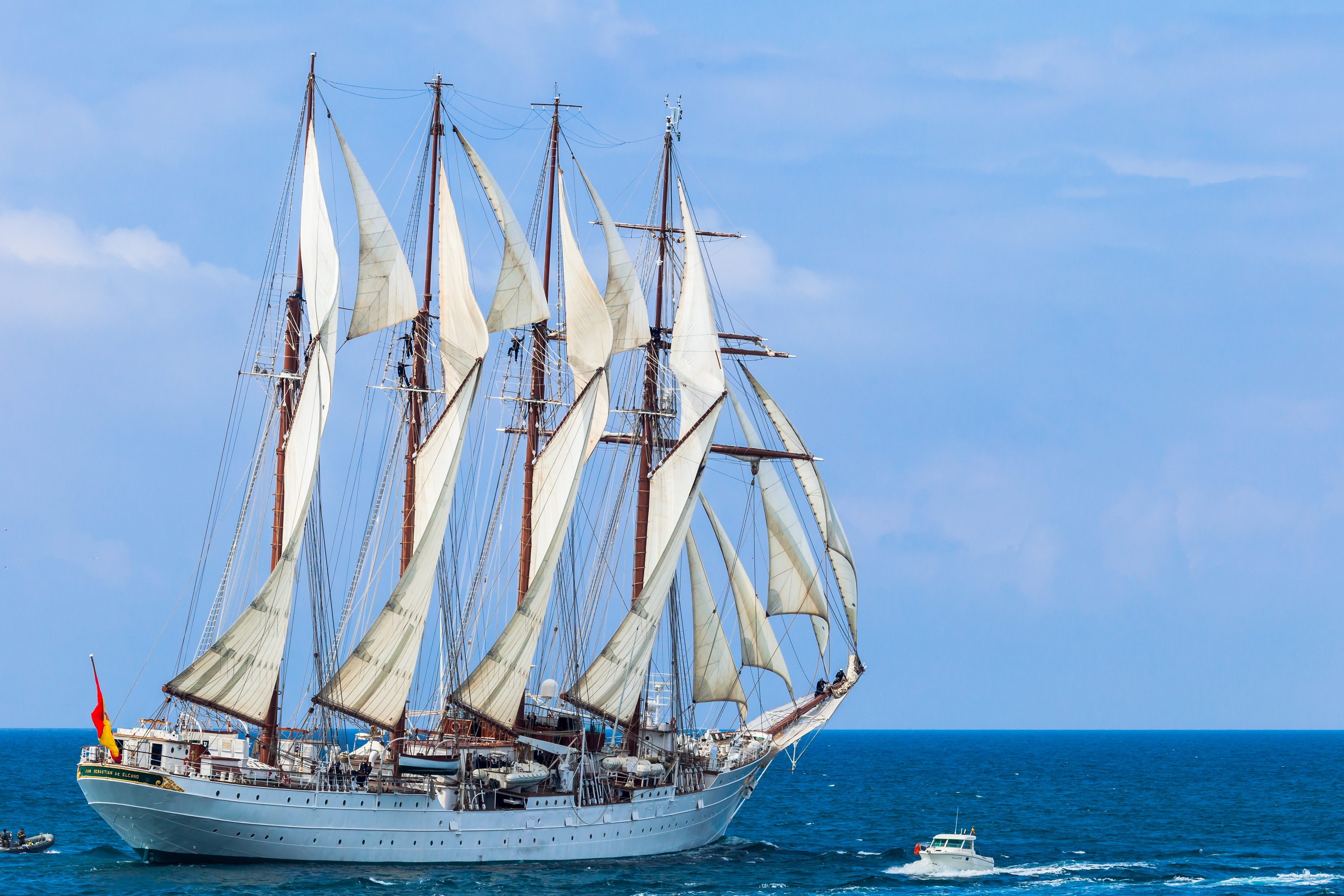 Description: A large white sail boat sailing in the ocean with a boat in the background and a boat in the foreground.