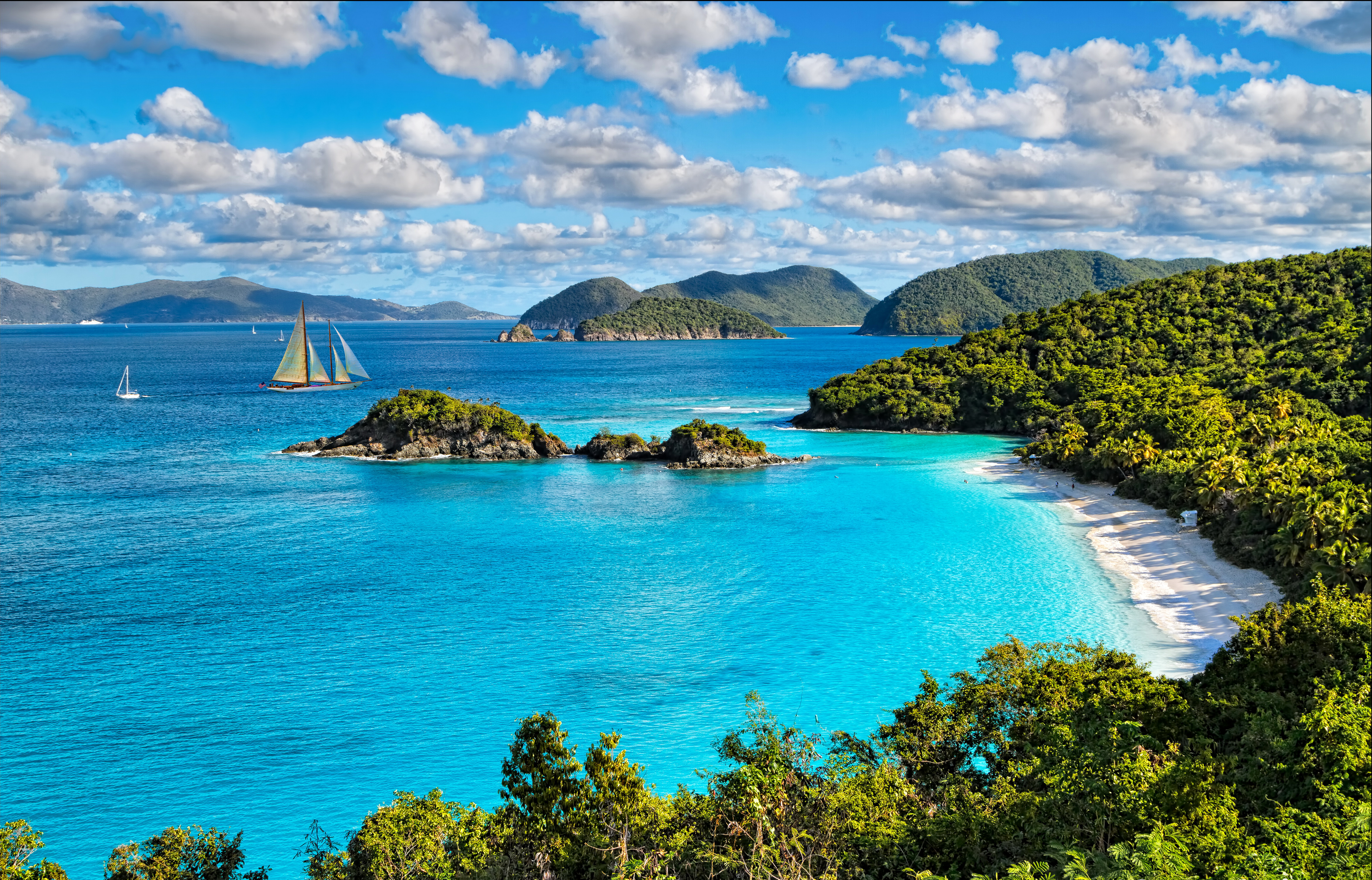 Description: A sailboat is sailing in the blue water near a beach and forested area with trees and a white sand beach.