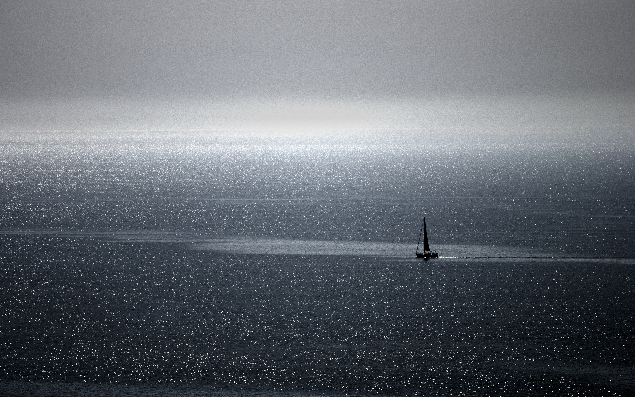 Description: A sailboat is out on the ocean in the foggy day.