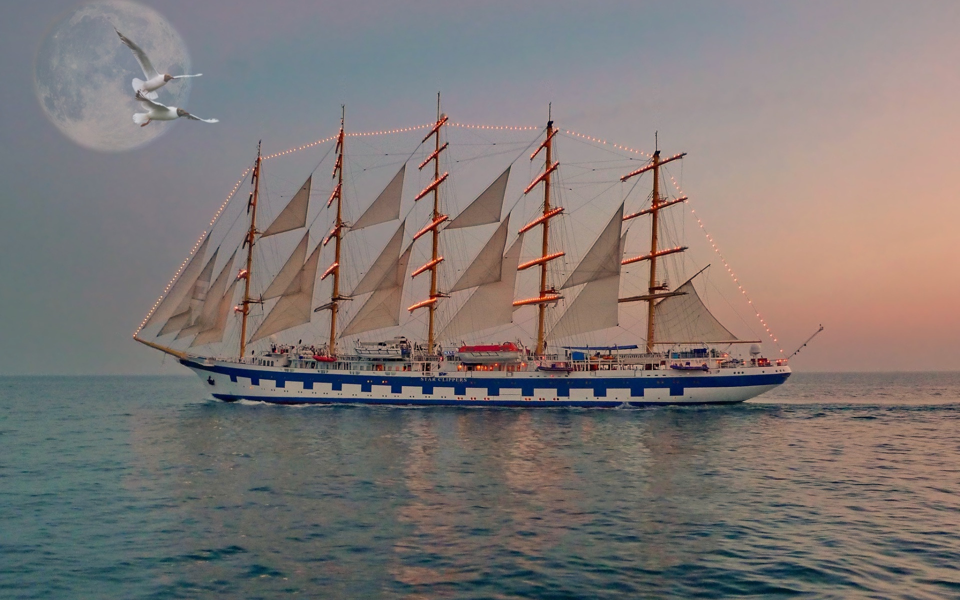 Description: A large sailboat sailing across the ocean at night with a full moon in the background and a seagull flying overhead.