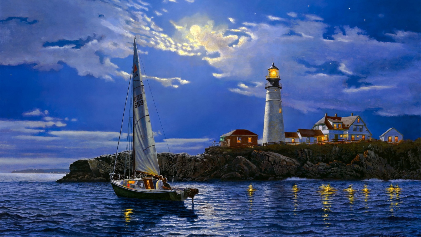 Description: A painting of a sailboat in the water near a lighthouse at night with a full moon in the sky.