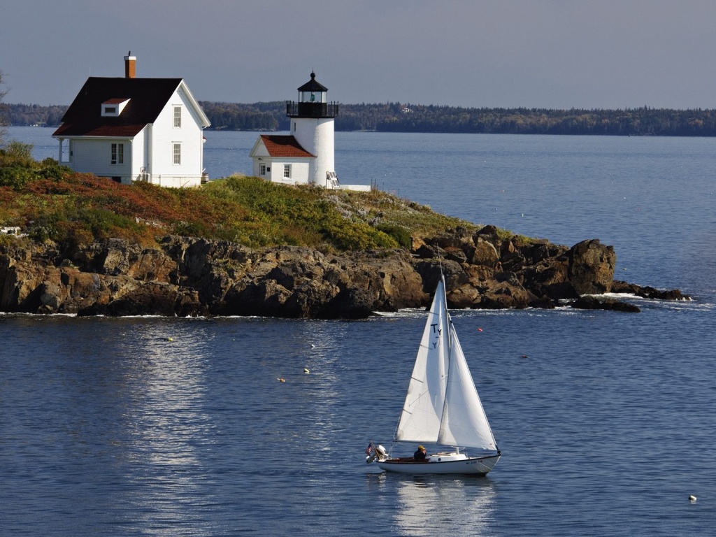 Description: A sailboat in the water near a lighthouse on a rocky island with a lighthouse in the background and a white house on a hill.