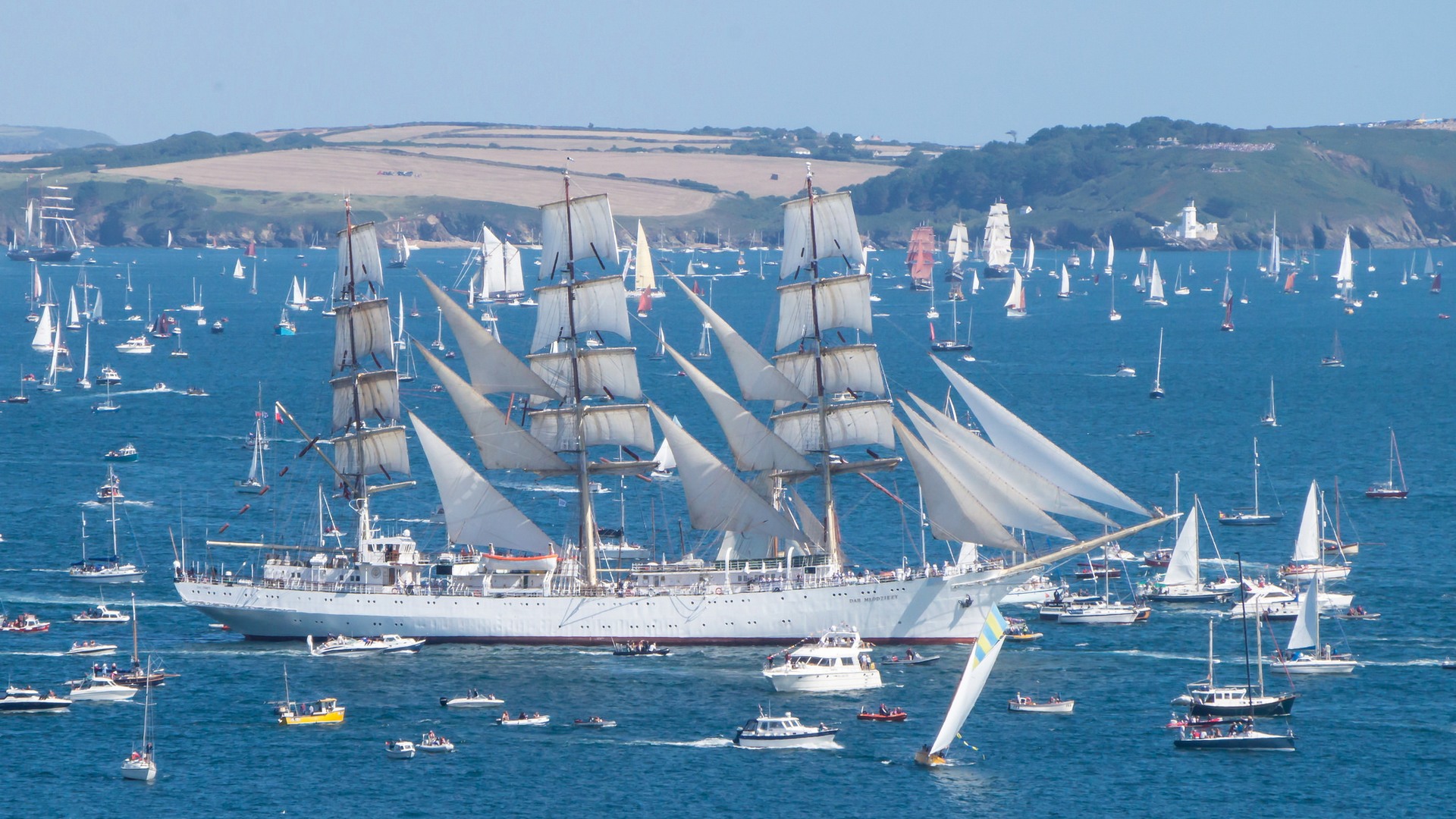 Description: A large sailboat sailing in the ocean with many smaller boats in the water behind it and a hill in the background.