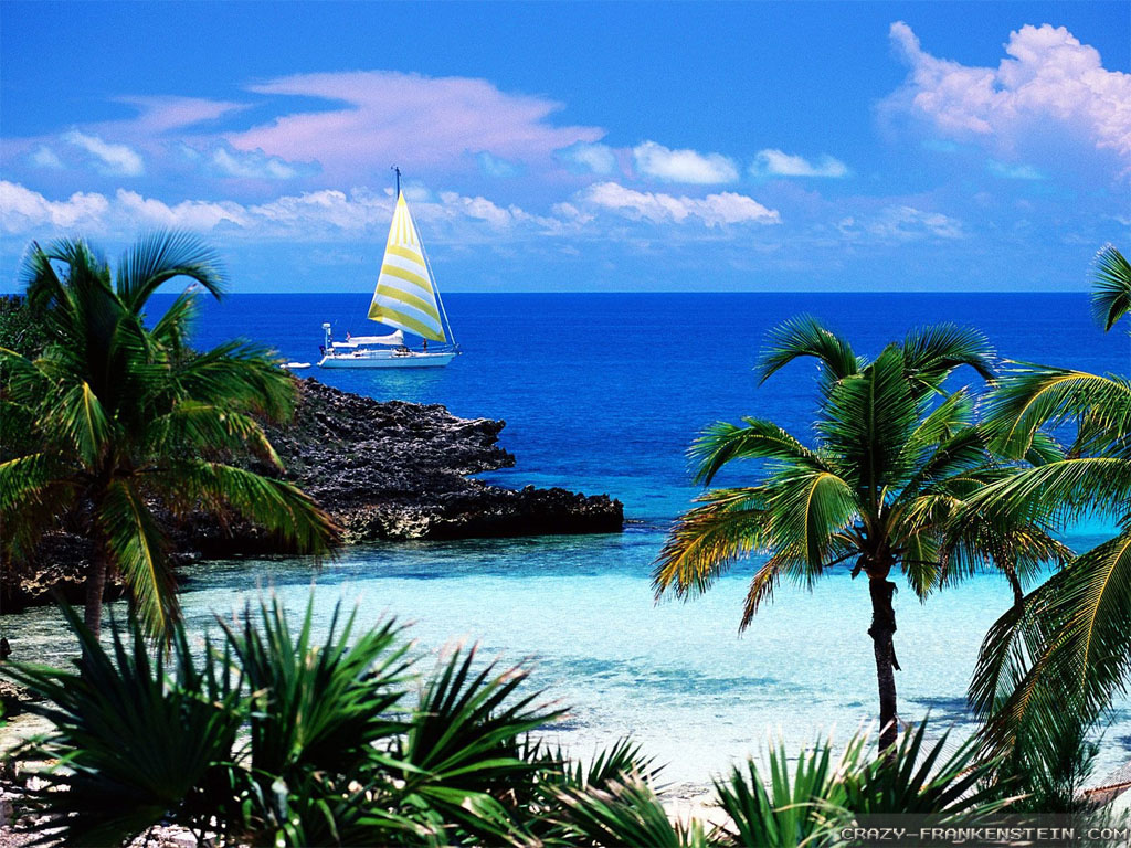 Description: A sailboat is sailing in the ocean near palm trees and a rocky shore with a blue sky and white clouds.