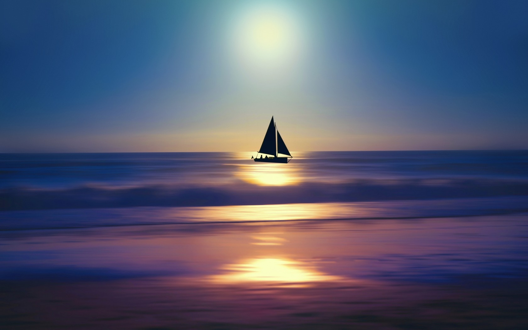 Description: A sailboat is sailing on the ocean at sunset or dawn with a bright sun in the background and a blue sky.