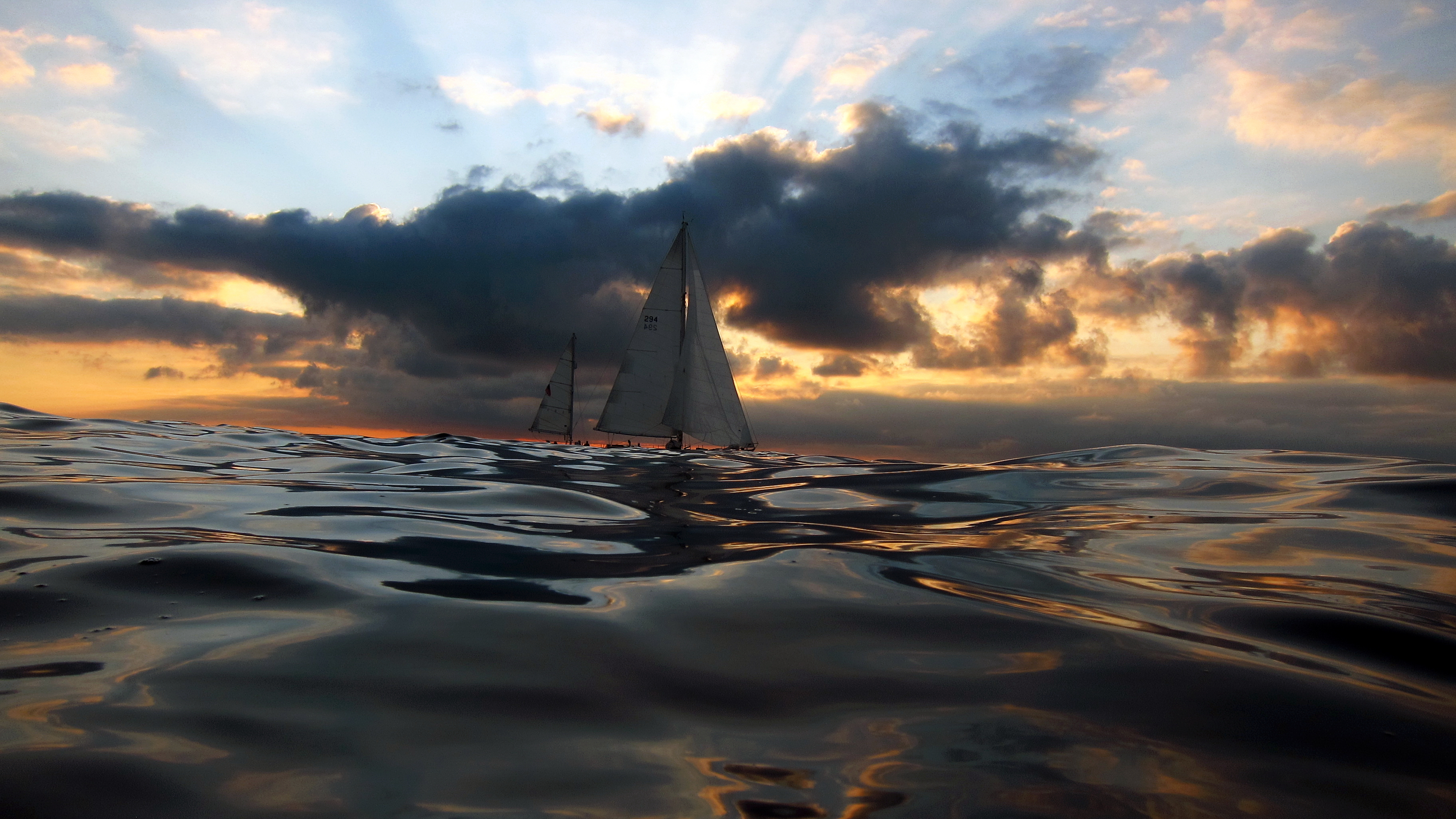 Description: A sailboat is sailing in the ocean at sunset or dawn with a cloudy sky above it and a few clouds above.