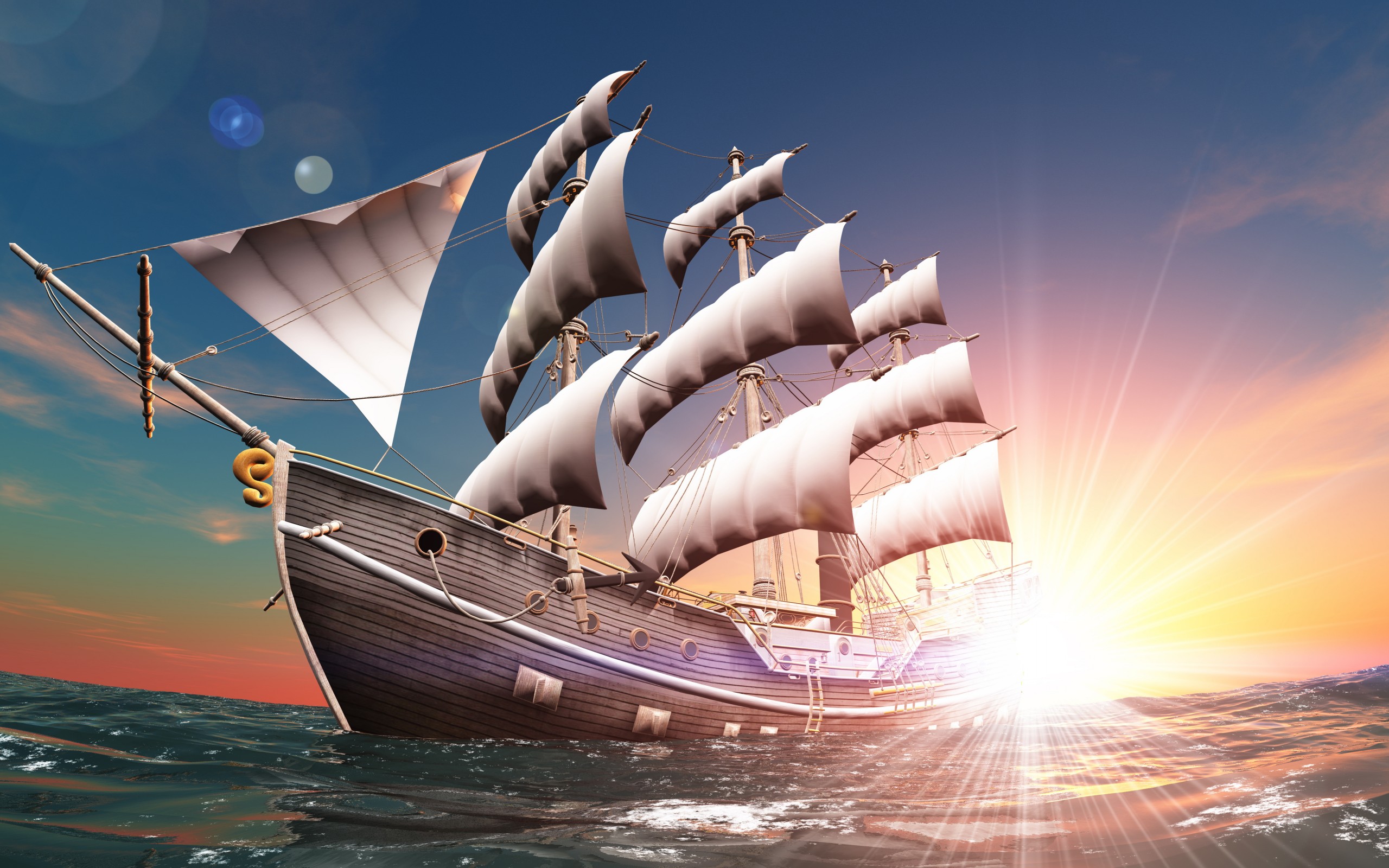 Description: A sailboat sailing in the ocean at sunset or sunrise with the sun shining behind it and a bright lens.