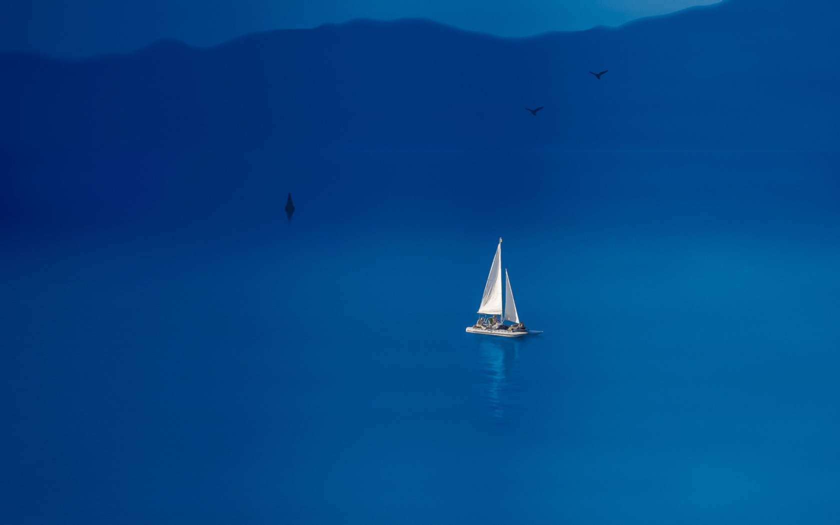 Description: A sailboat floating on a large body of water with birds flying around it in the distance.