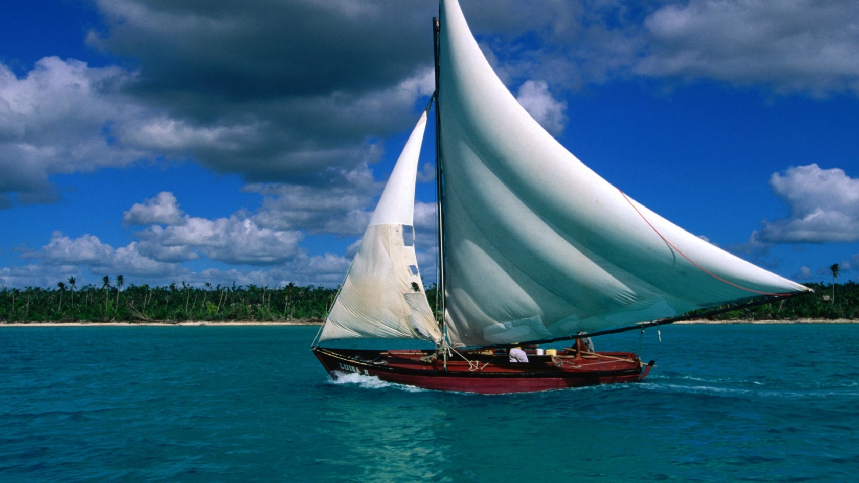 Description: A sailboat with white sails is in the ocean near a beach and palm trees on a cloudy day.