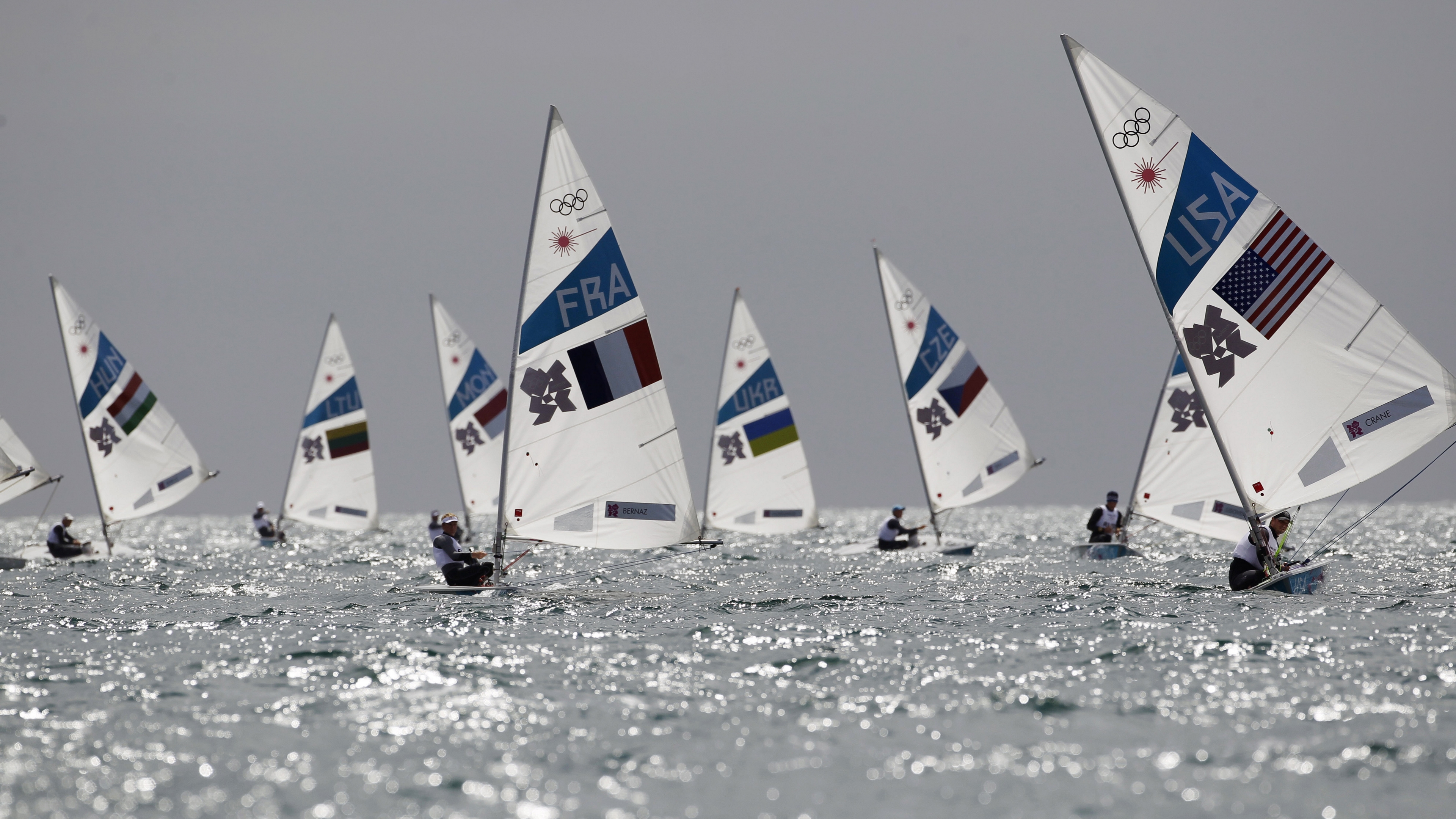 Description: A group of sailboats sailing in the ocean on a sunny day with a grey sky in the background.