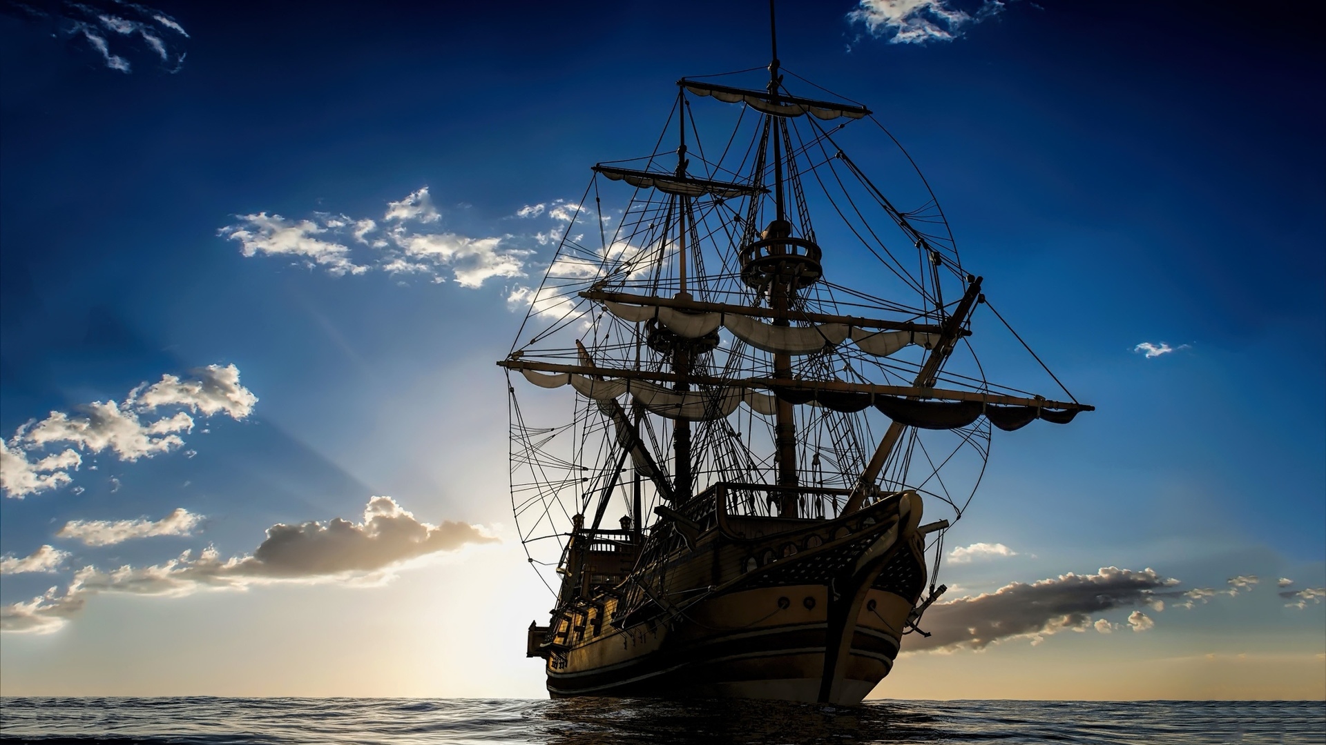 Description: A large sailing ship in the ocean at sunset or dawn with clouds in the sky above it and a sunbeam.