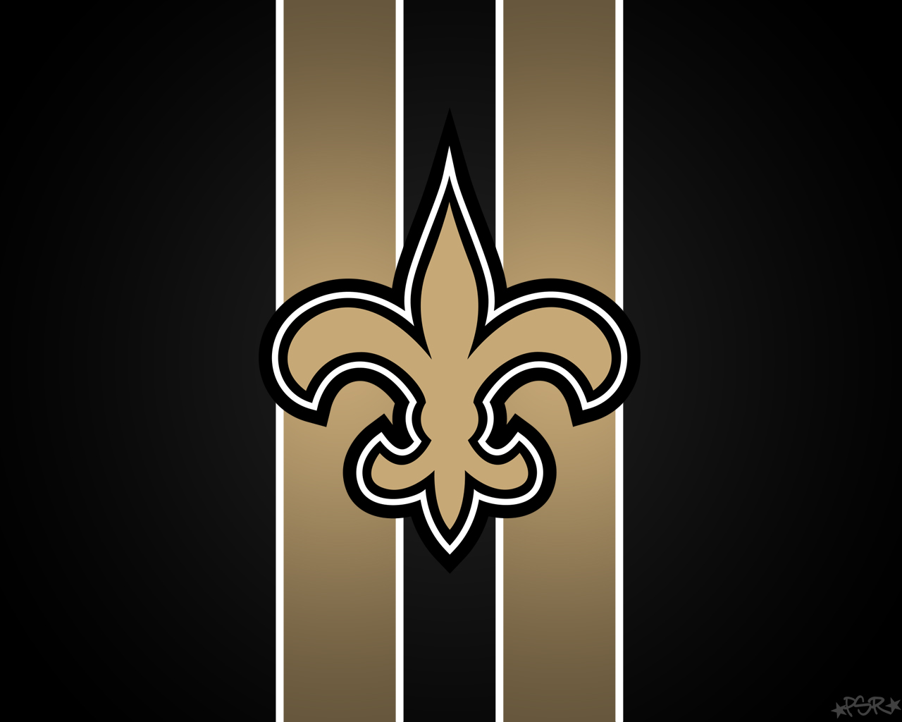 Description: A new orleans saints logo on a black and gold striped background with a black and white stripe in the center.