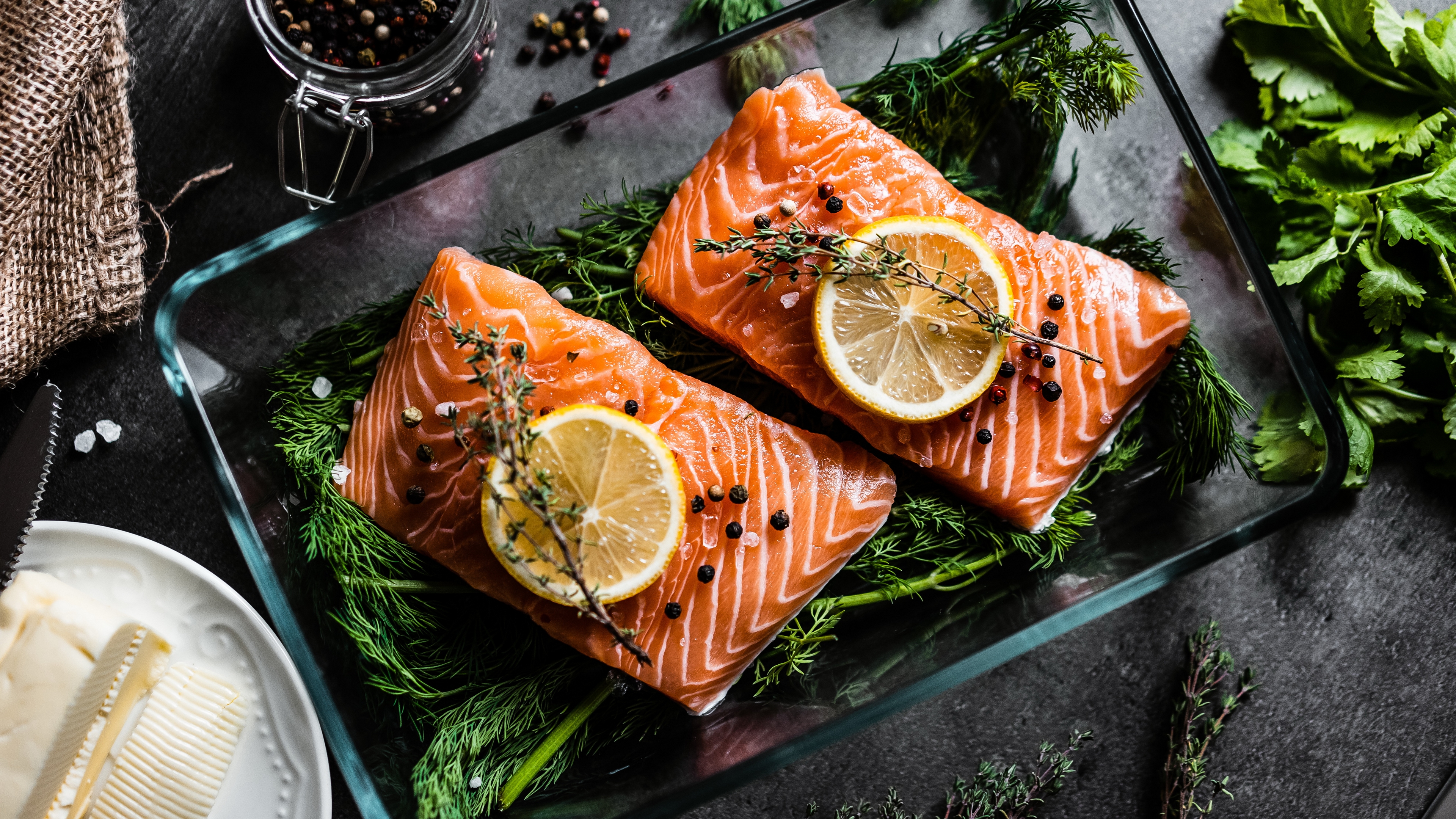 Description: Two salmons with lemon slices and herbs on a glass tray with a brush and knife on a table.