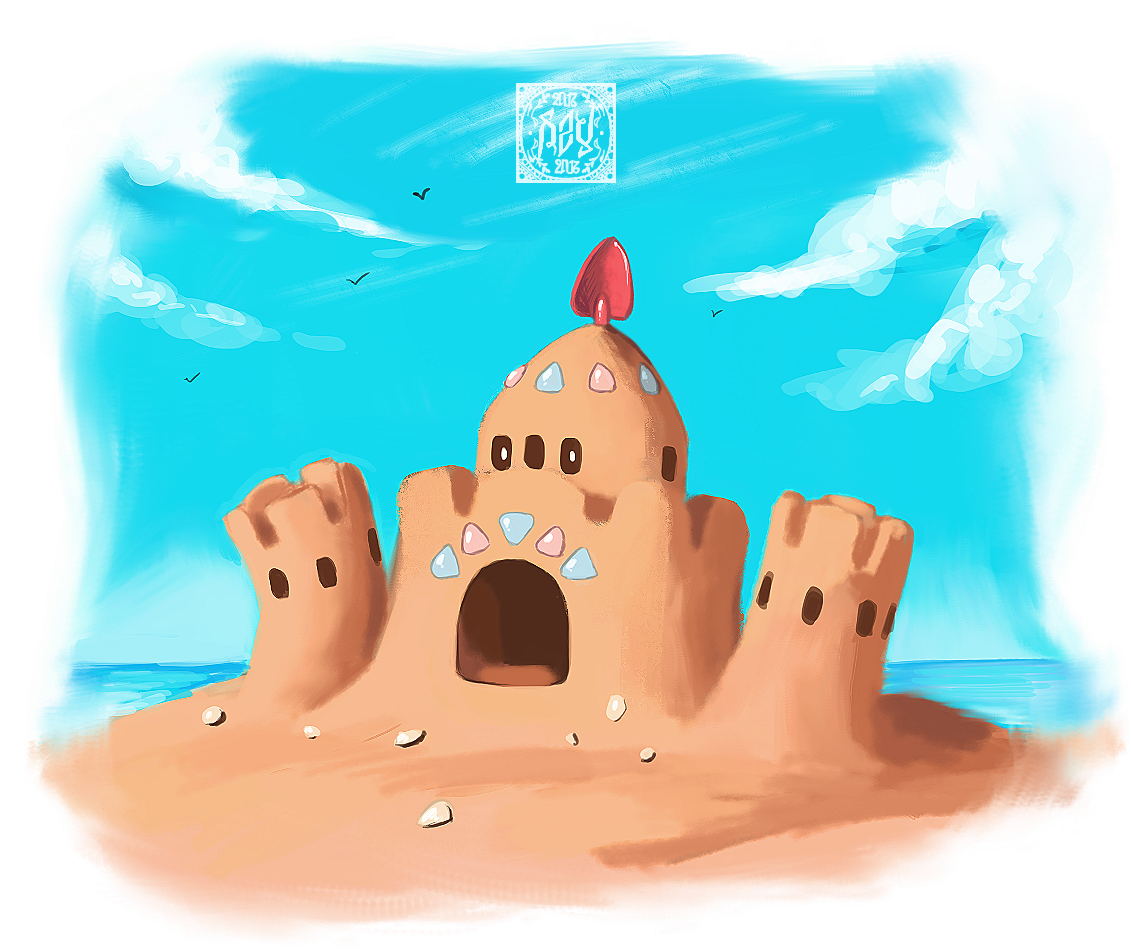 Description: A sand castle with a red ball on top of it and a blue sky in the background with clouds.