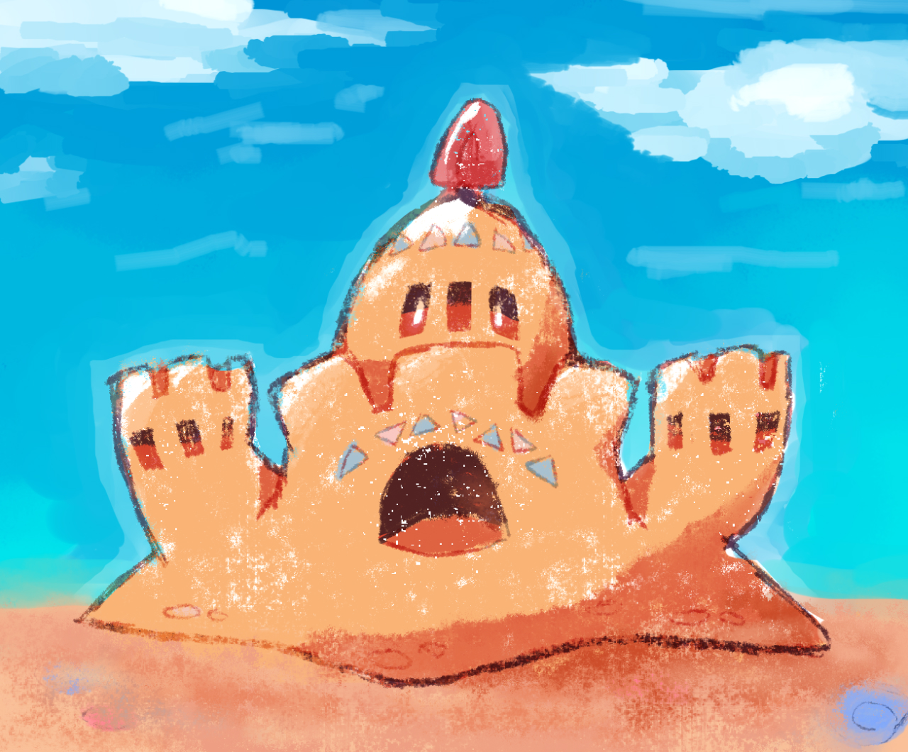 Description: A sand castle with a red hat on top of it in the sand with a blue sky in the background.