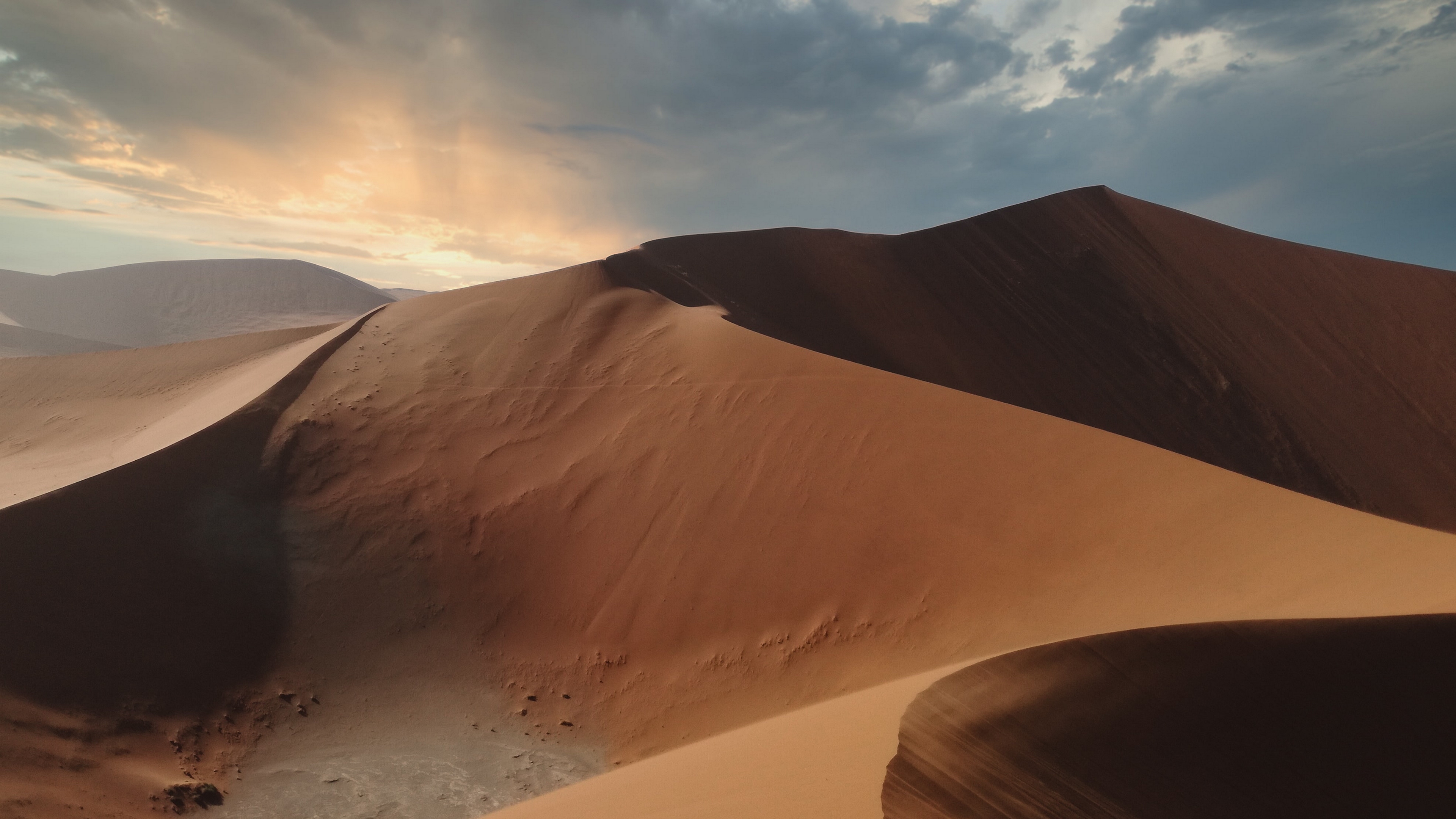 Description: A large sand dune with a sky background and clouds in the sky above it.