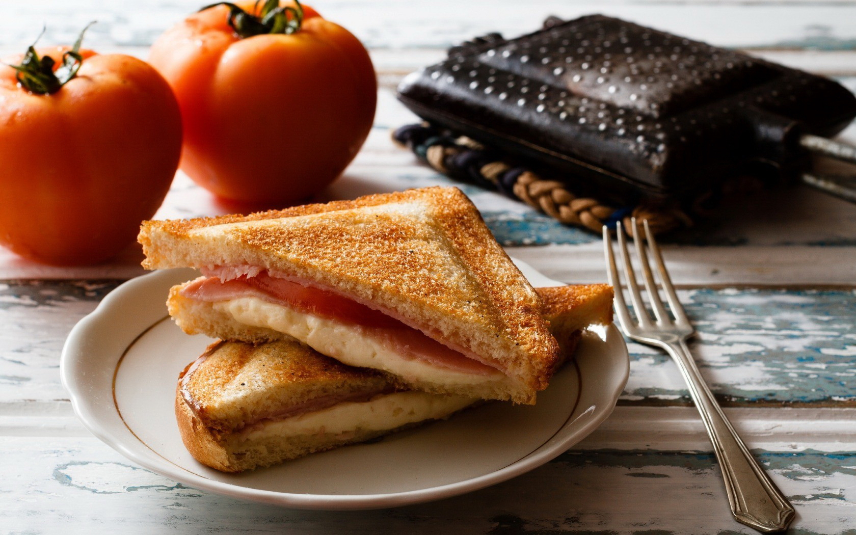 Description: A sandwich on a plate with a fork and a wallet on the table next to it and tomatoes and a wallet.