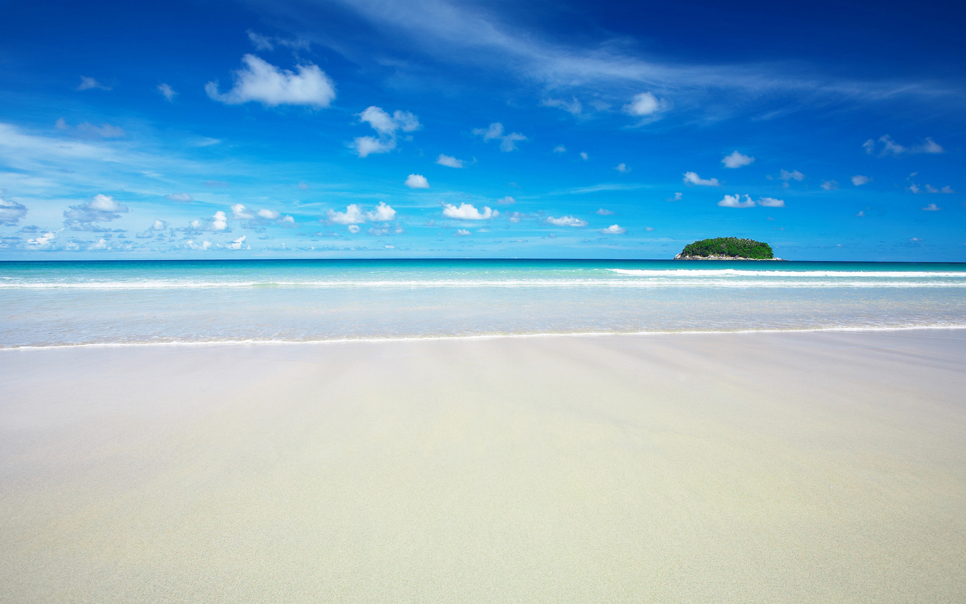 Description: A sandy beach with a small island in the distance on a sunny day with blue skies and clouds above.