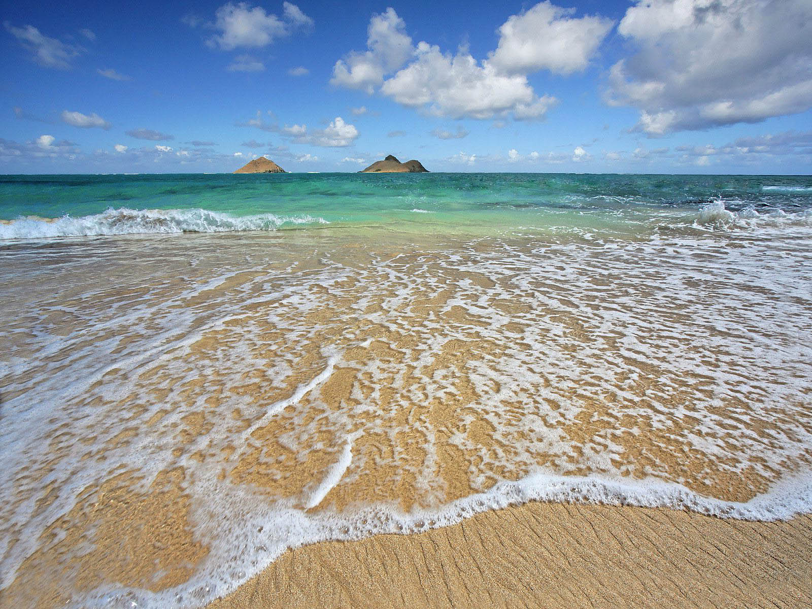 Description: A sandy beach with waves coming in to shore and a small island in the distance on a sunny day.