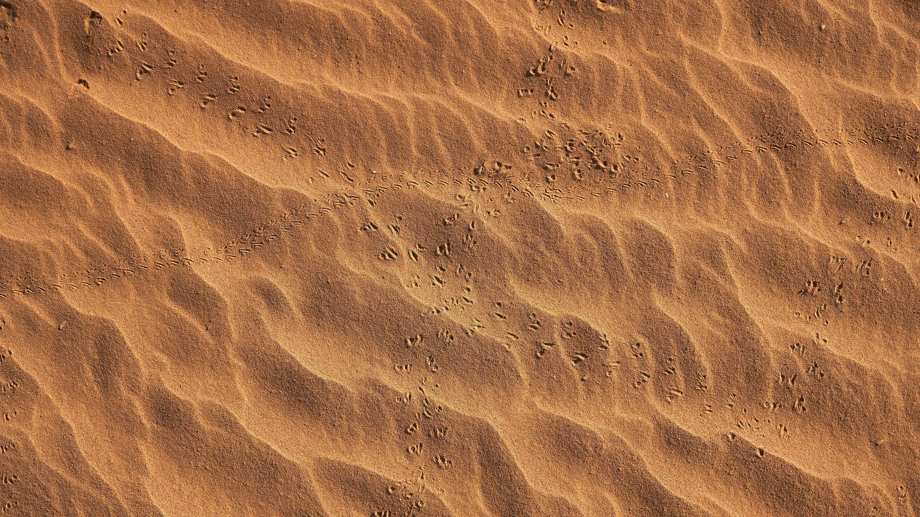 Description: A sandy area with a few footprints on it and a bird in the distance with a bird in the foreground.
