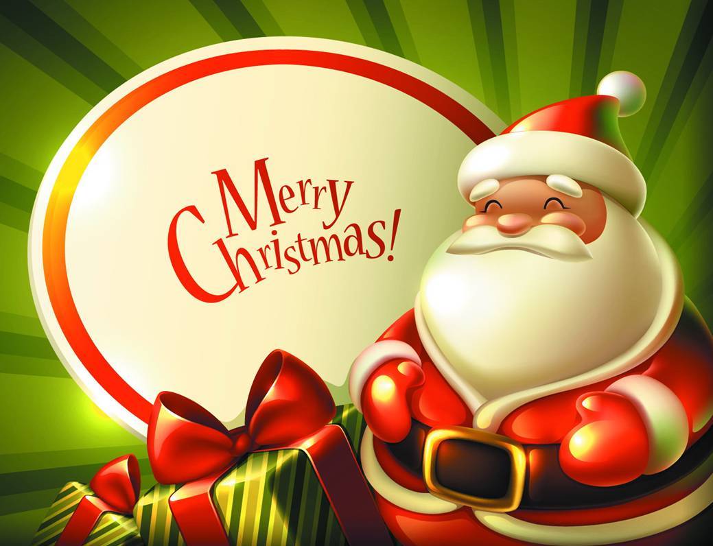 Description: A christmas card with a santa clause holding a sign and presents in front of it with a green background.