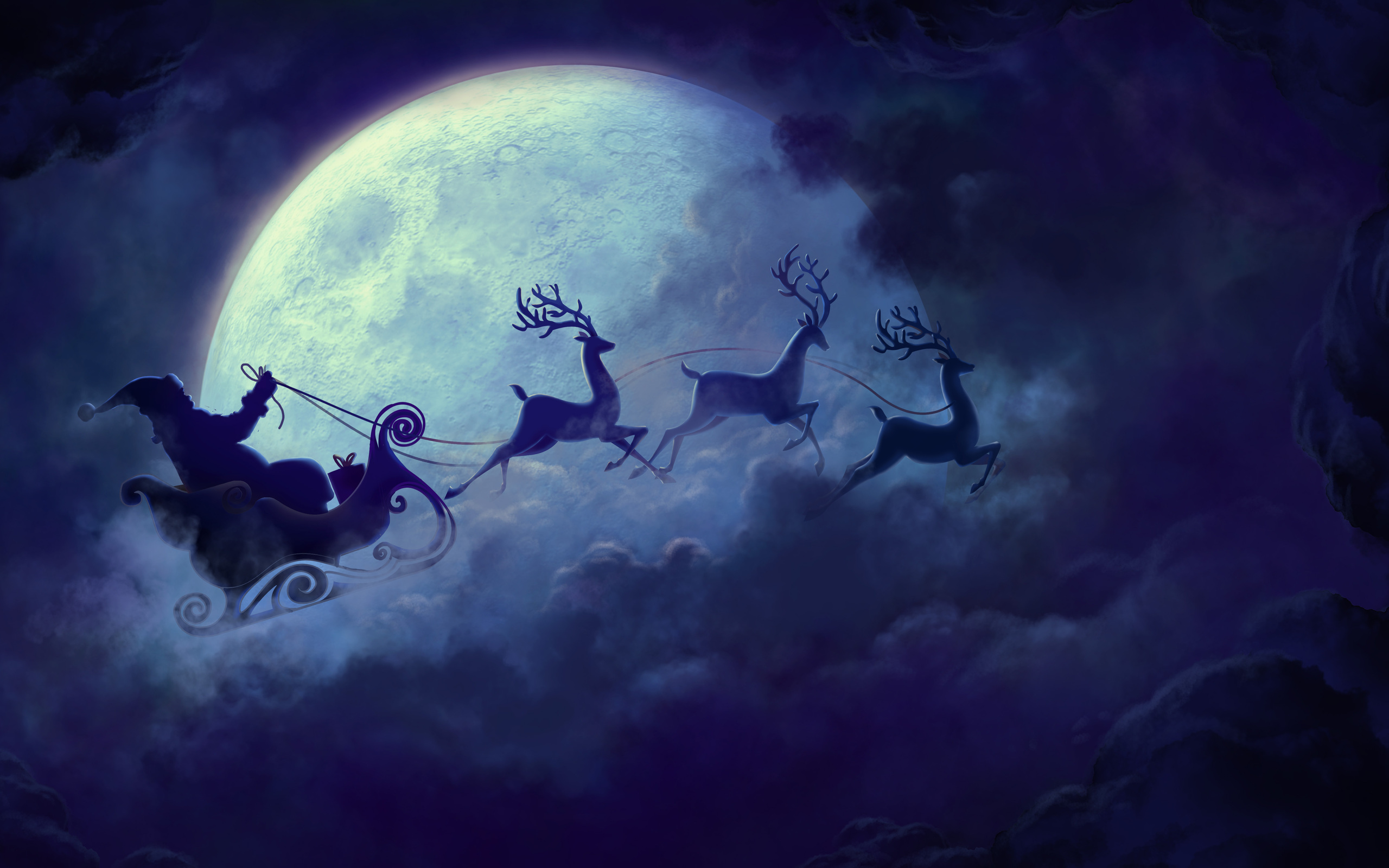 Description: A painting of santa claus riding in a sleigh with reindeers in front of a full moon.
