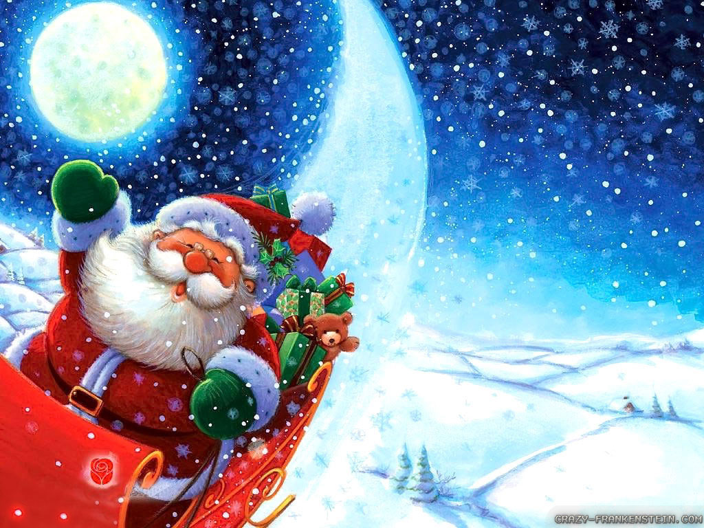 Description: A painting of santa claus riding a sleigh in the snow with a teddy bear on his lap.