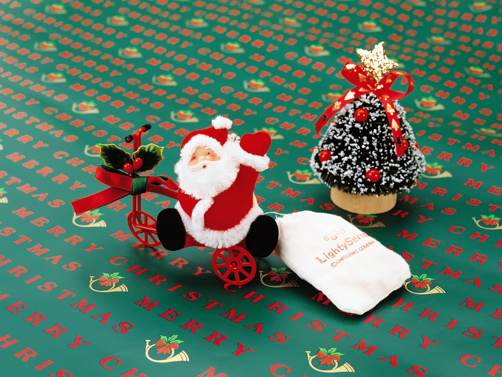 Description: A santa clause doll sitting next to a christmas tree on a green background with red and gold decorations and a small christmas tree.