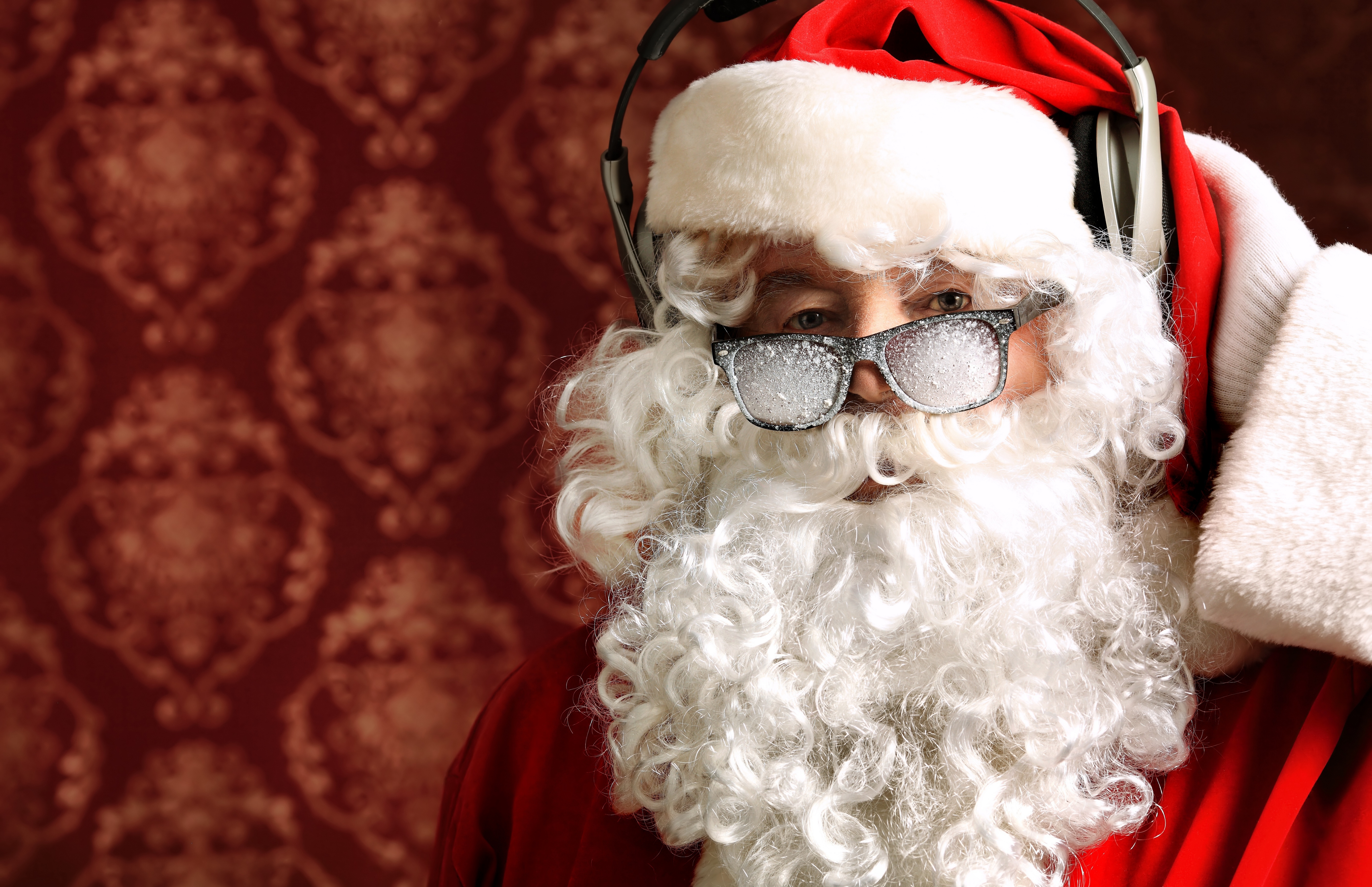 Description: A man dressed as santa claus with sunglasses and a santa hat on his head and a red background with a red wall.