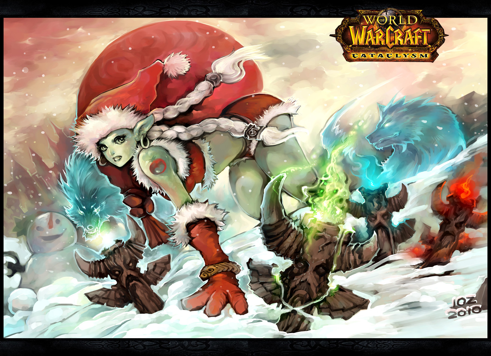 Description: A painting of a woman in a santa hat and two other women in snow gear.