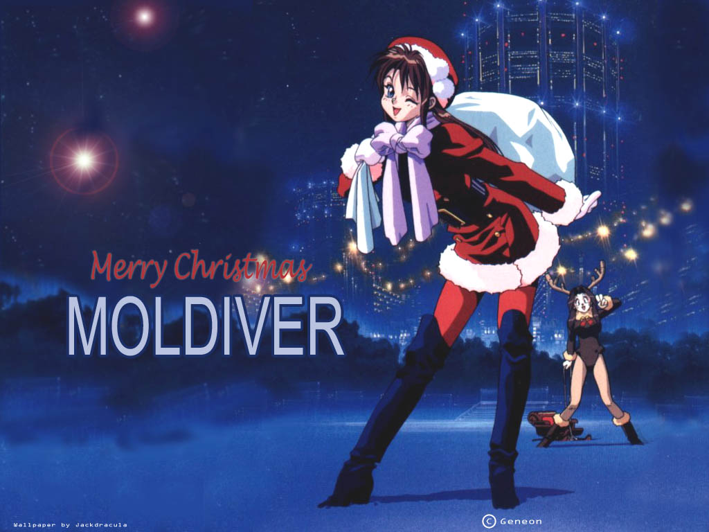 Description: A woman in a santa suit holding a bag of presents in front of a city skyline with fireworks and stars.