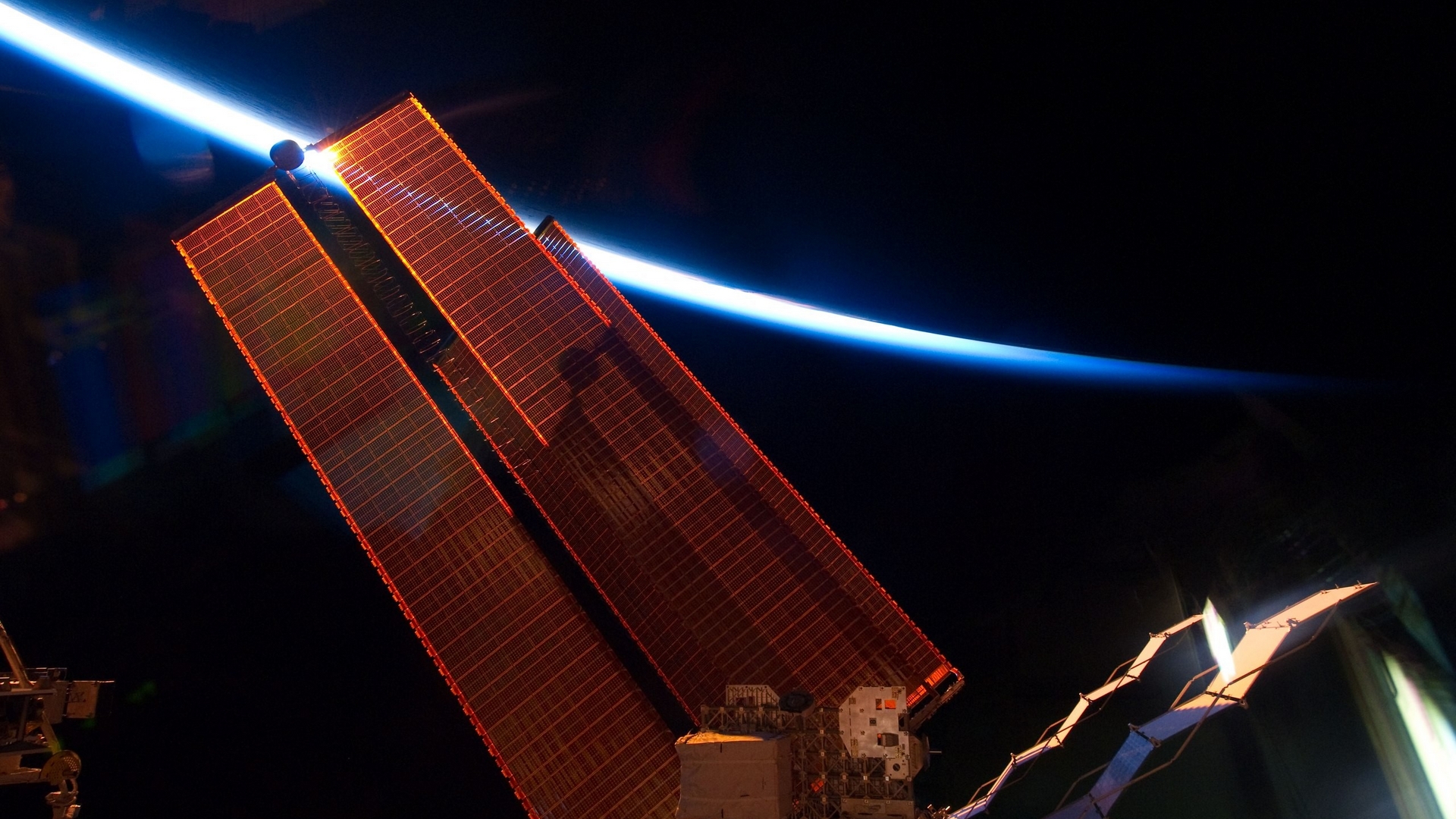 Description: A satellite satellite is shown in the dark sky with a bright light behind it and a blue streak in the sky.