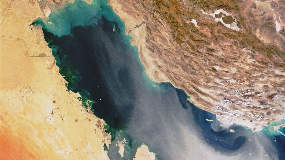 Description: A satellite image of a body of water in the middle of a desert area with a red patch in the middle.