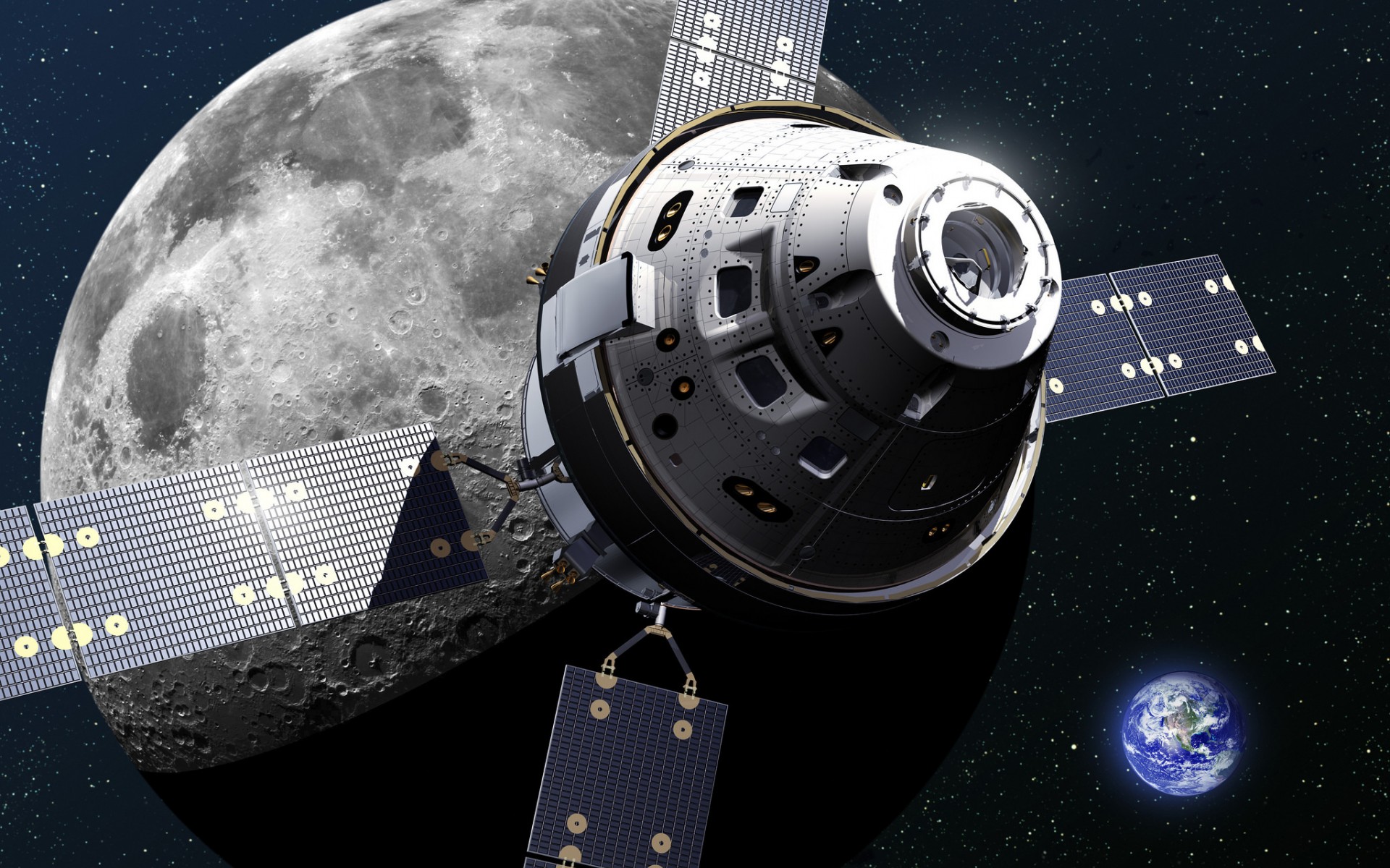 Description: A satellite satellite with a moon in the background and a satellite attached to it's side.