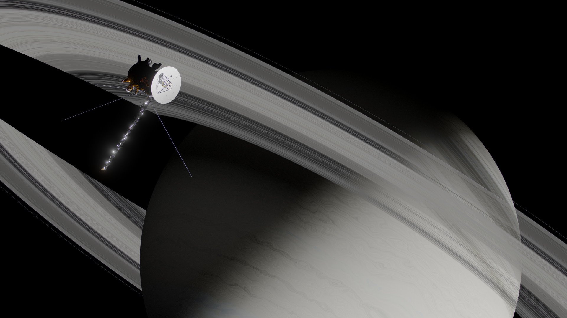 Description: A satellite satellite flying over saturn with saturn in the background and saturn in the foreground.
