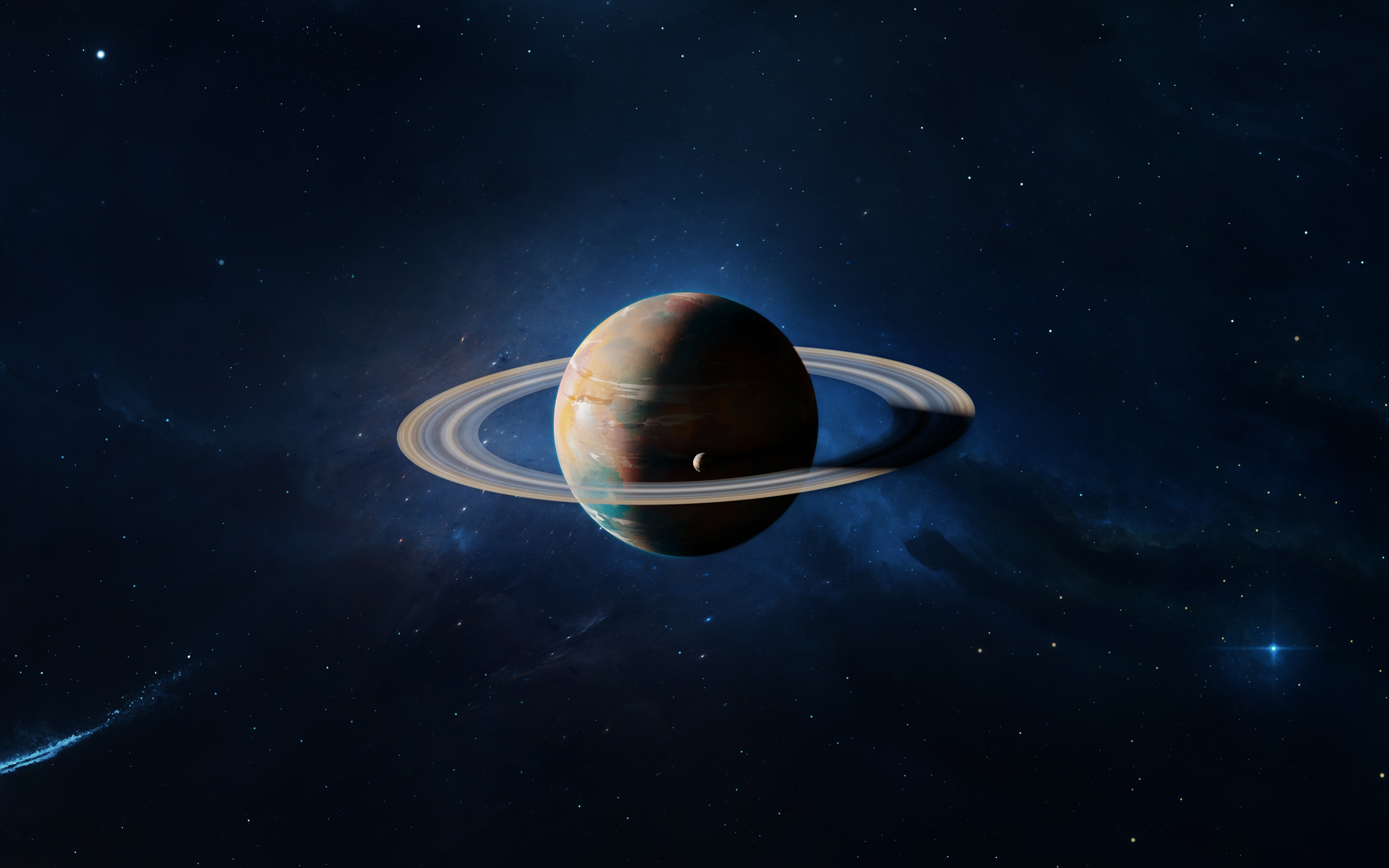 Description: A saturn like object in the middle of a space with stars in the background and a blue sky with stars.