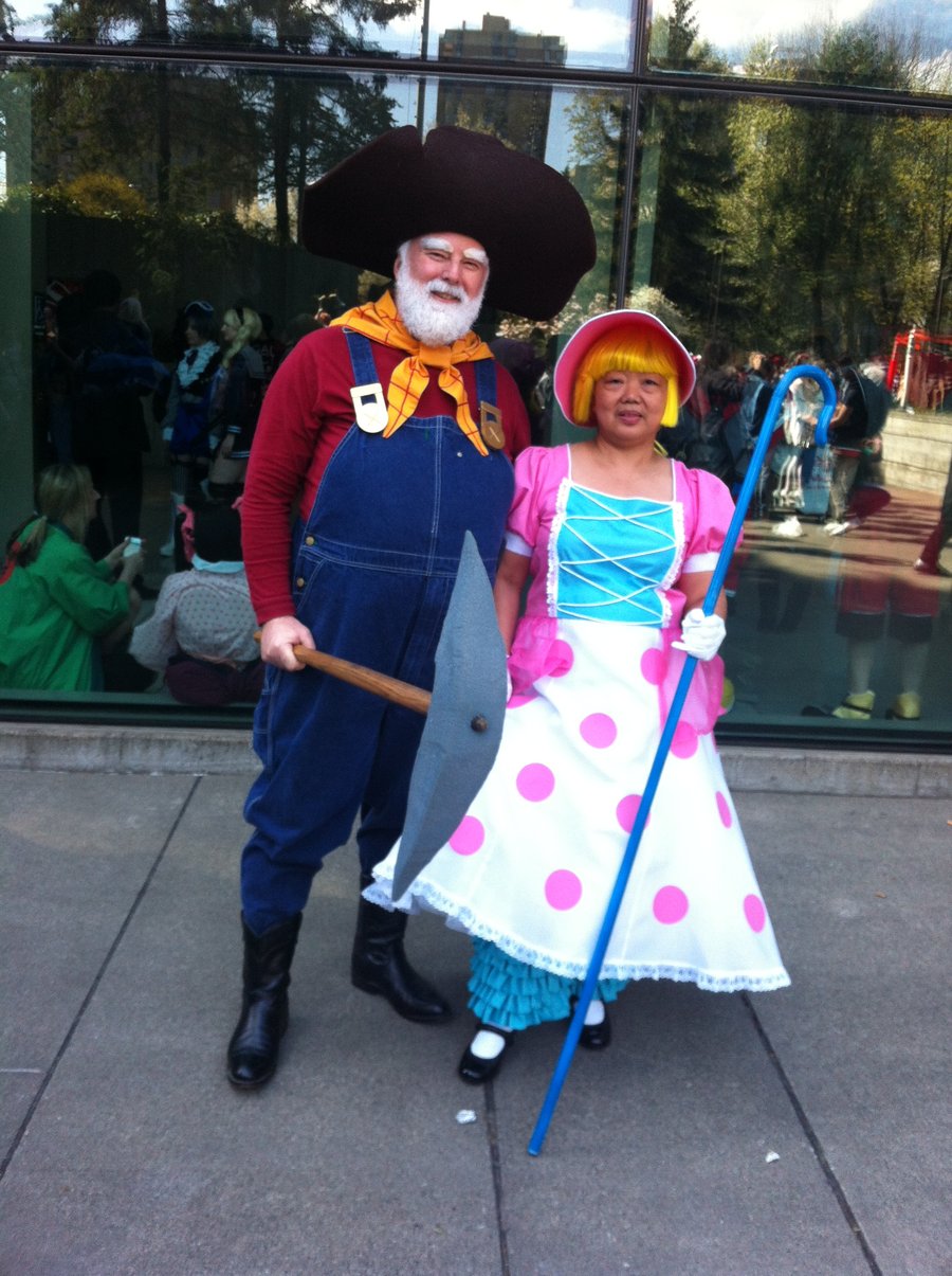 Description: A man and a little girl dressed up as a scarecrow and a wizard with a shovel and a hat.