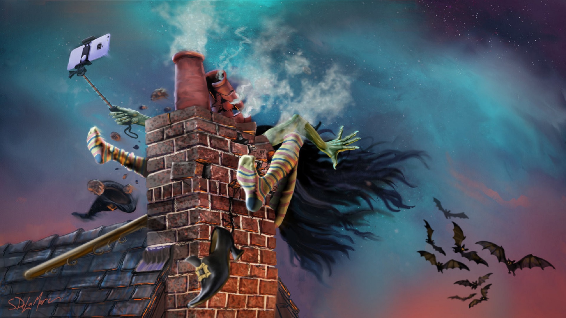 Description: A painting of a brick chimney with a scary face on it and bats flying around it and a person on the roof.