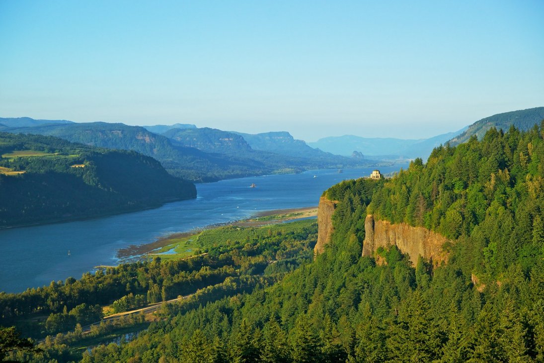 Description: A scenic view of a lake and mountains from a high viewpoint of a cliff with a house on it.