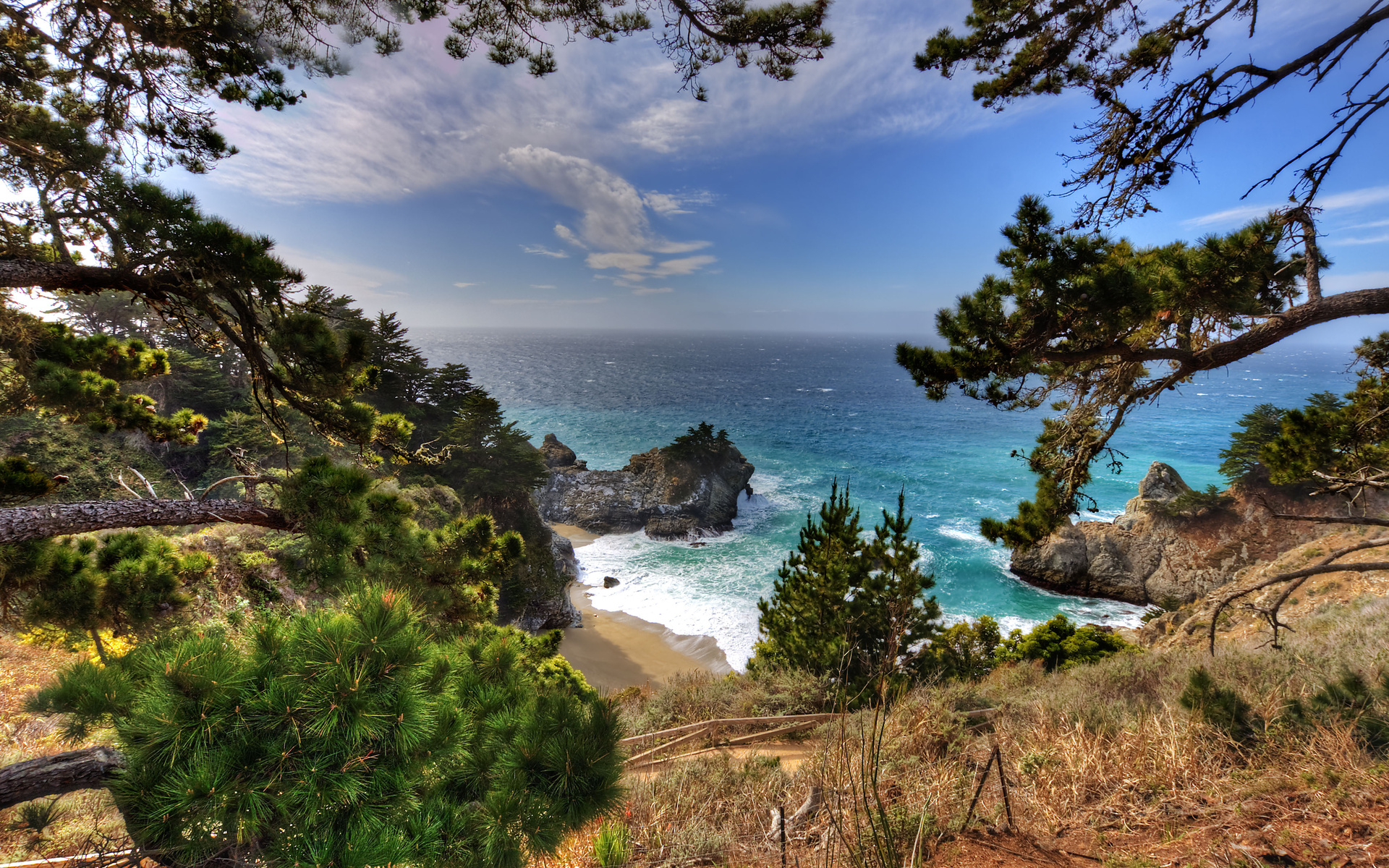 Description: A scenic view of the ocean from a hill top with trees on the side of it and a blue sky with clouds.