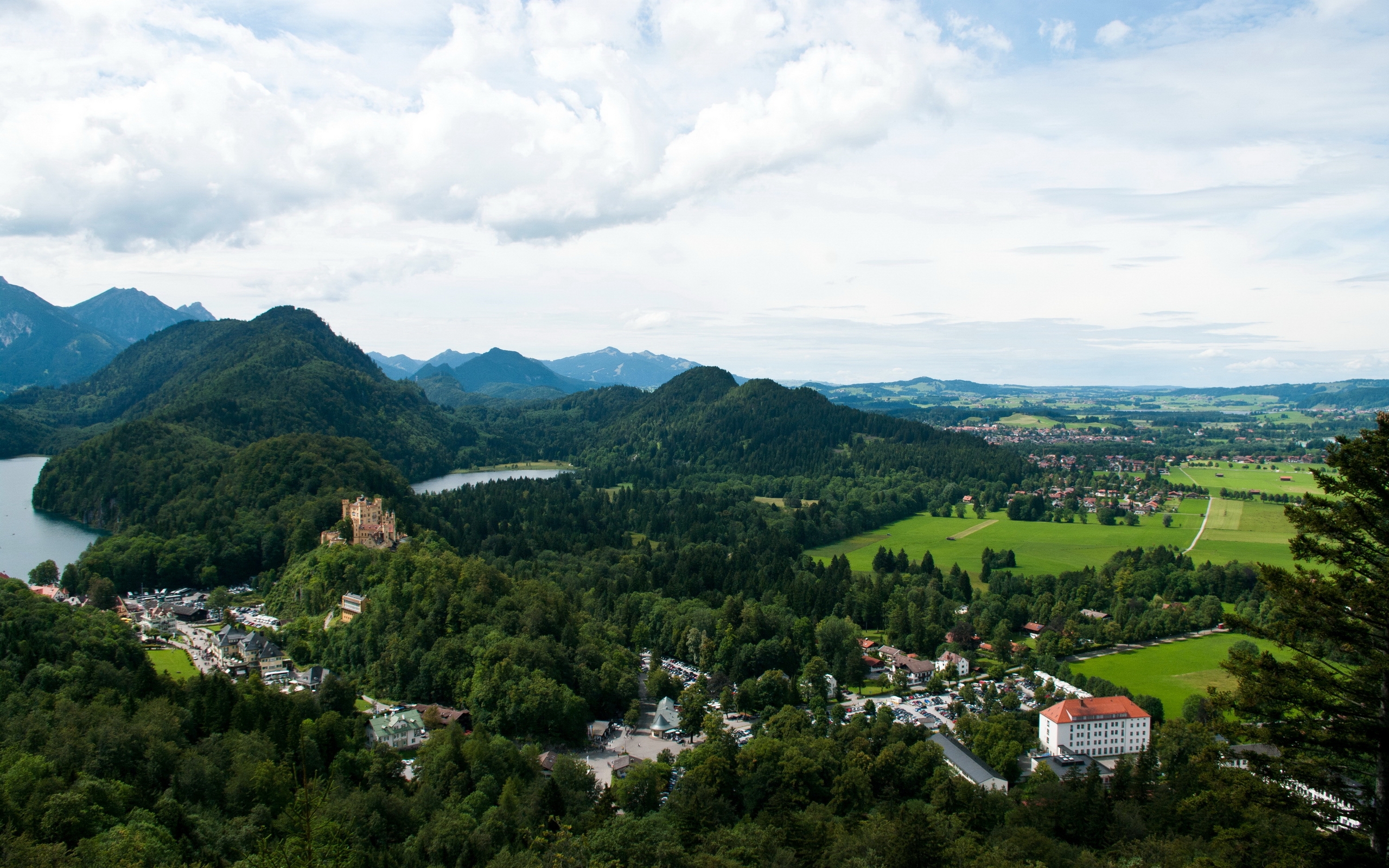 Description: A scenic view of a valley and a lake surrounded by mountains and forests with a cloudy sky above it.