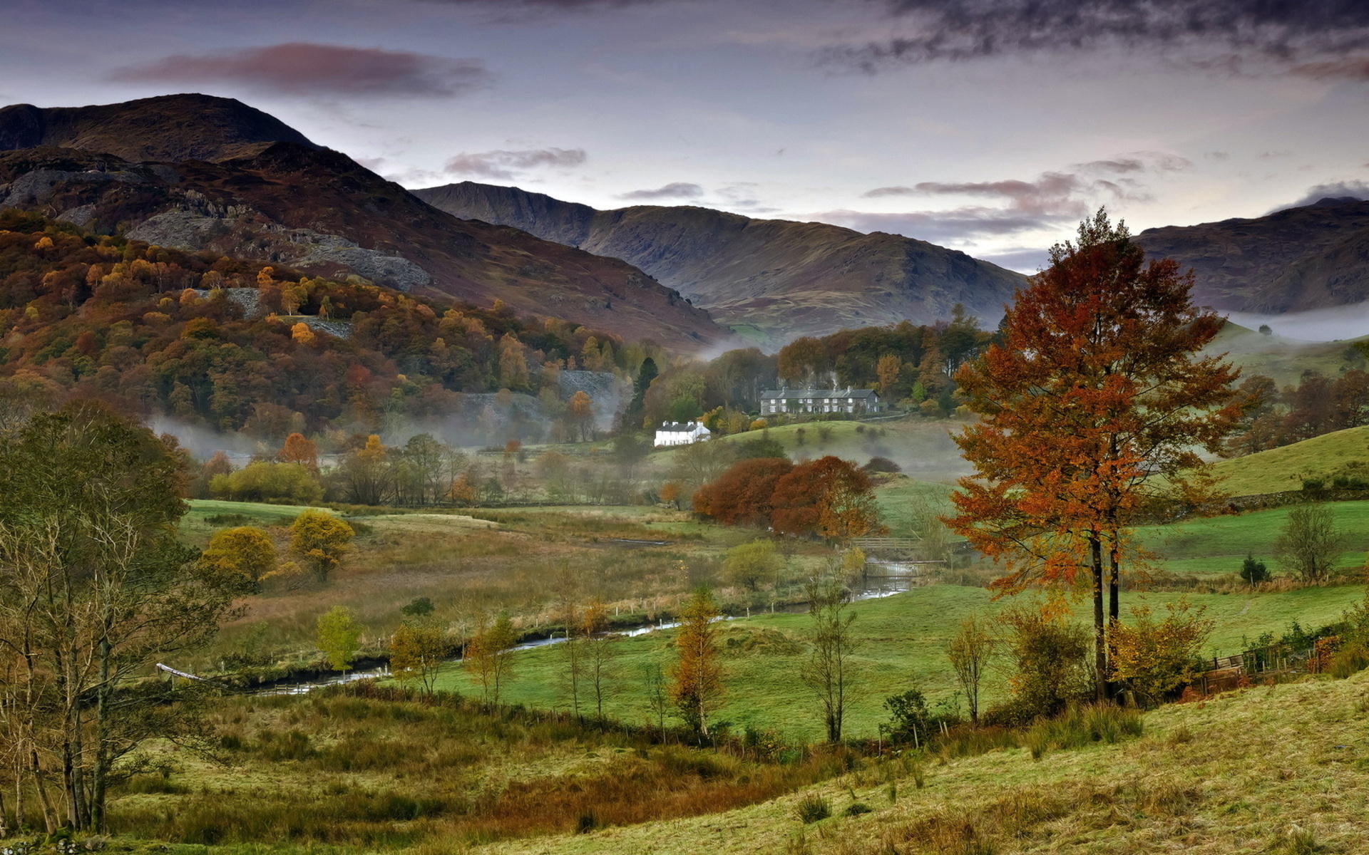 Description: A scenic view of a valley with a house in the distance and mountains in the background with fog in the air.