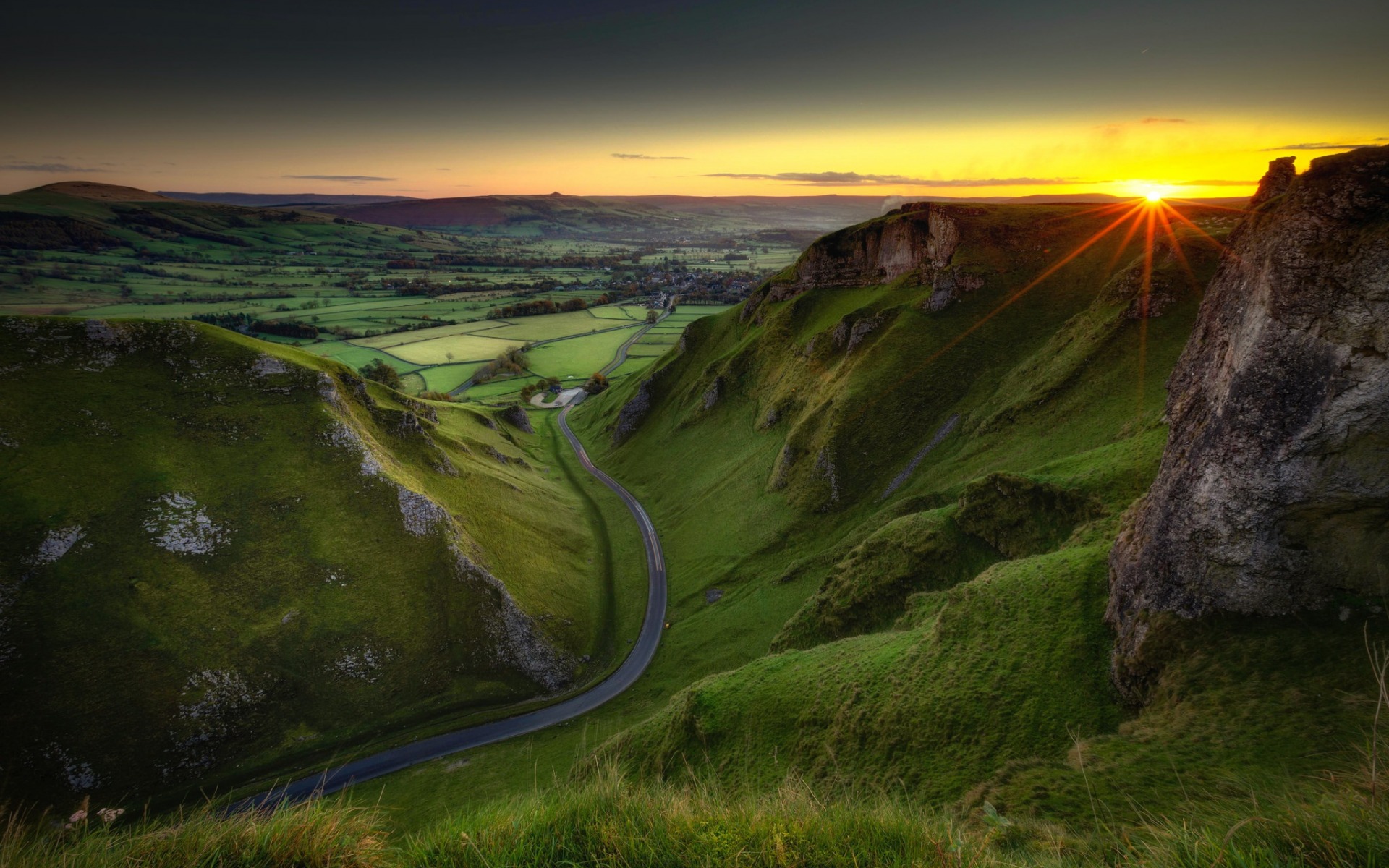 Description: A scenic view of a road winding through a valley at sunset with the sun setting in the distance over the valley.
