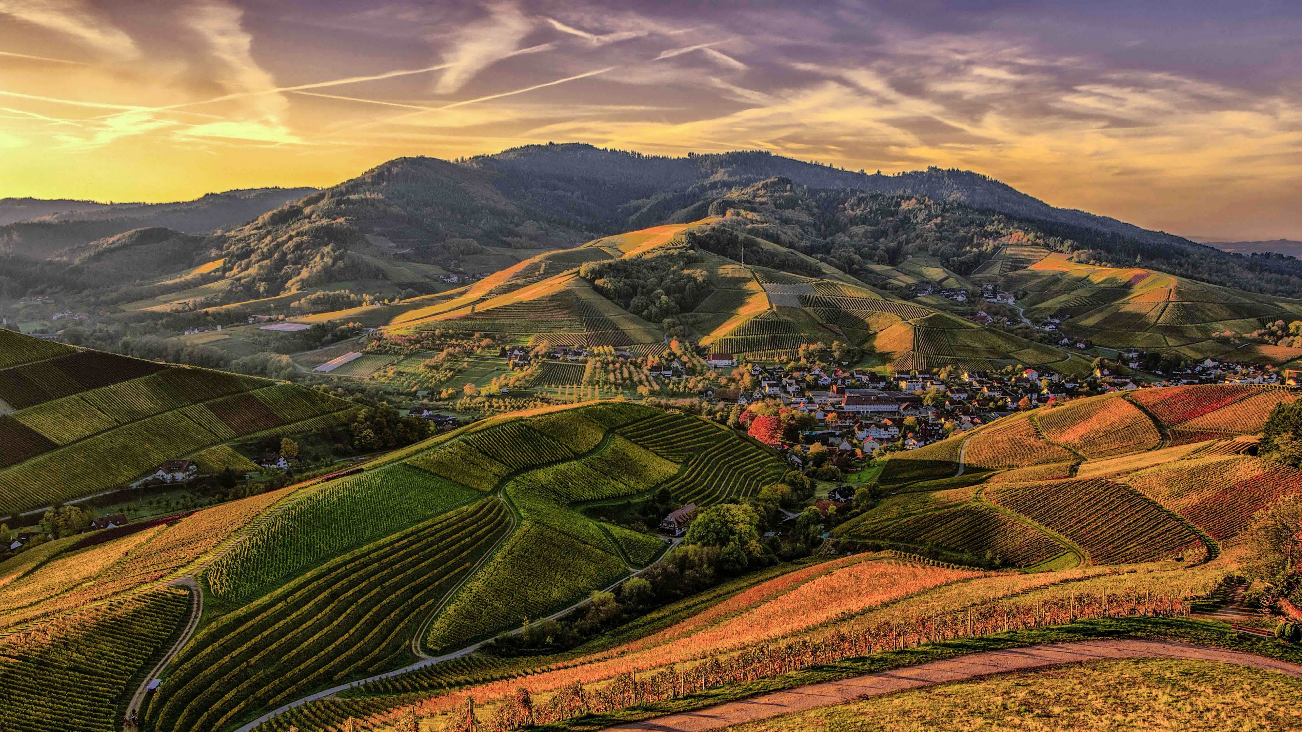Description: A scenic view of a valley with a village on the top of it and mountains in the background at sunset.