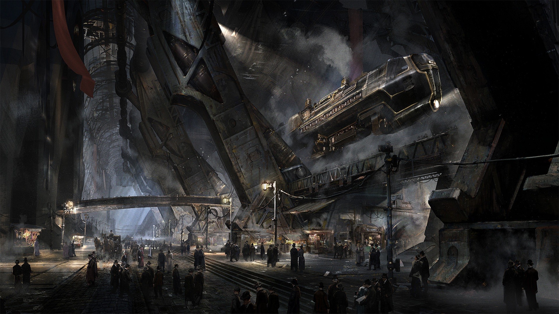 Description: A scene of a sci - fi city with a train on the tracks and people standing around it.